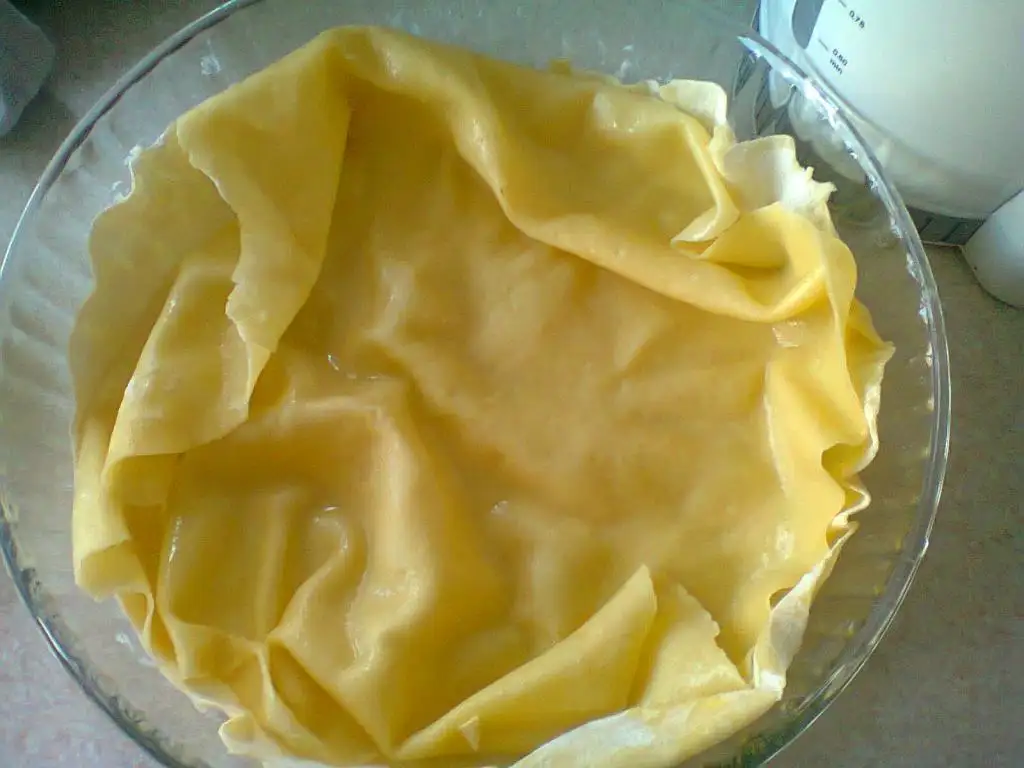 Üzerine tekrar ıslatılan yufkalar serilir, yağlanır.