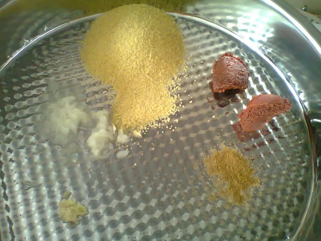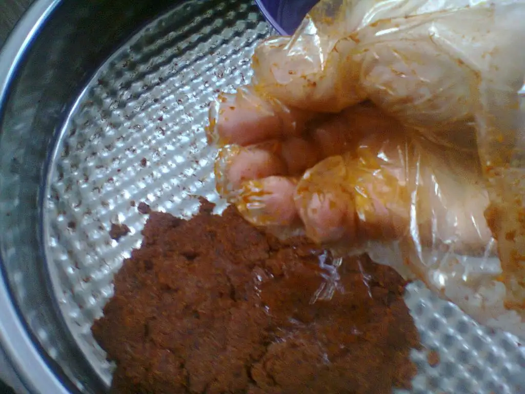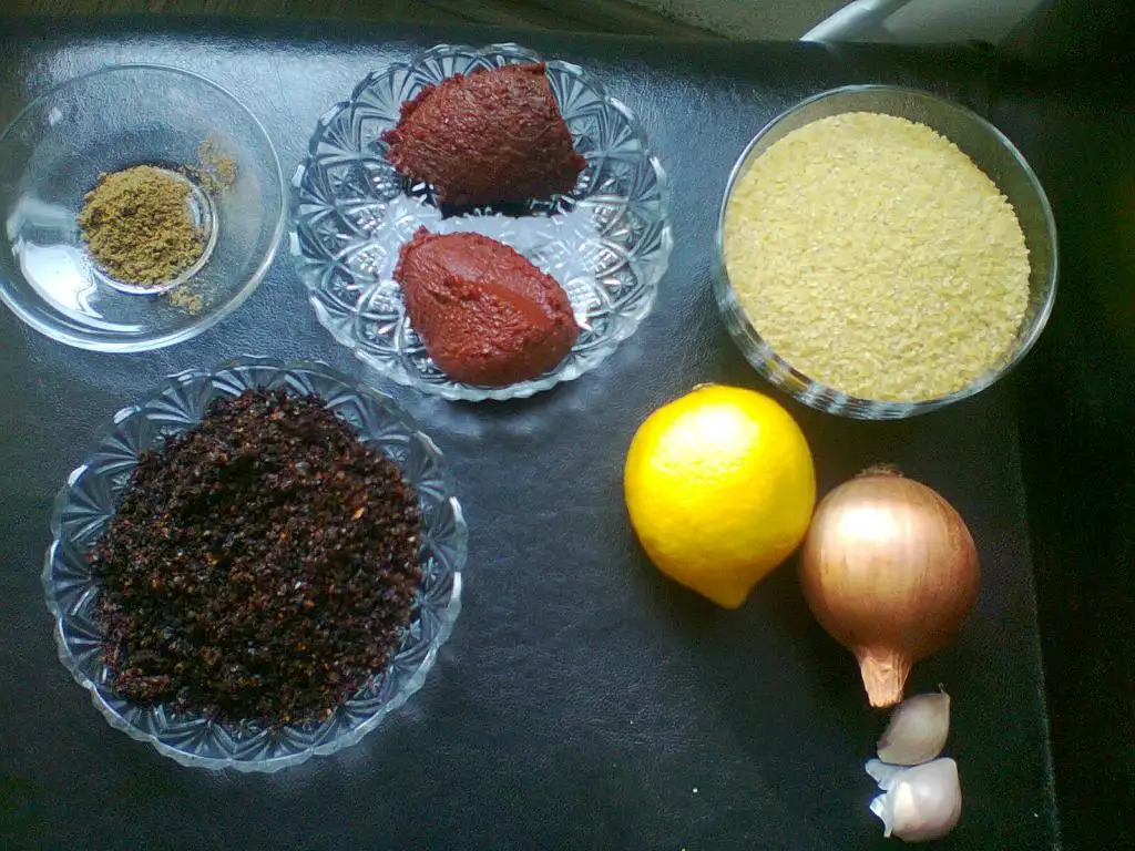 Soğan ve sarımsak rendenin en ince yerinde rendelenir. Bulgur,kimyon, rendelenmiş soğan, sarımsak biber ve domates salçasıyla beraber çiğ köfte tepsisine alınır.