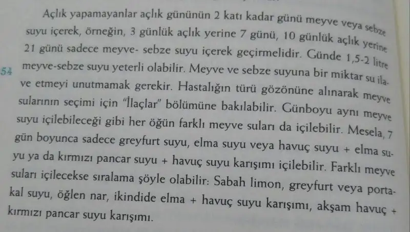 Aslında kitapda şöyle bisey var.Bunun öncesinde Açlık terapisi var sahurda iftarda sadece su başka hiç birsey yok.3 günlük 10 günlük şeklinde ve dayanilmasi muhtemelen zor.Bu diyeti yapamayan Meyve sebze sularıyla yapsin deniliyor.