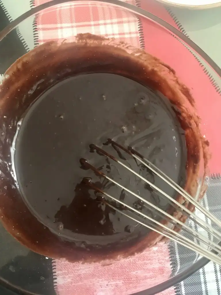 Sonra malzemelerin hepsini bir kaba aktarıyoruz. Üzerine bu çikolata-tereyağ karışımını da ekleyip bir güzel çırpıyoruz. Pürüzsüz olana kadar.
