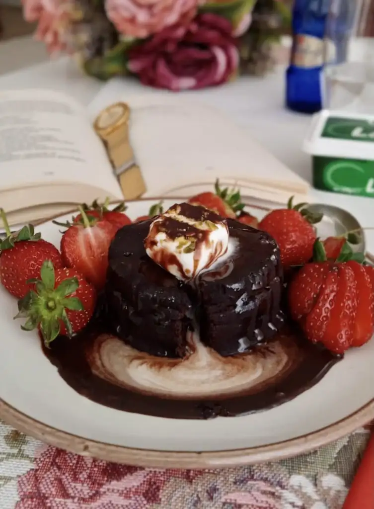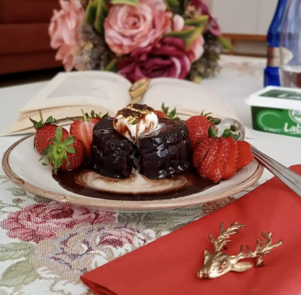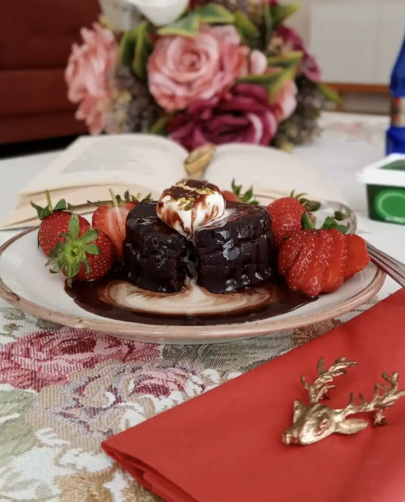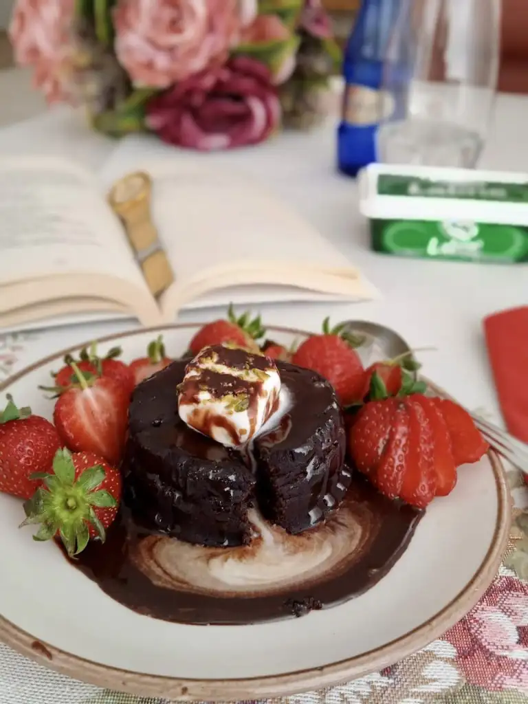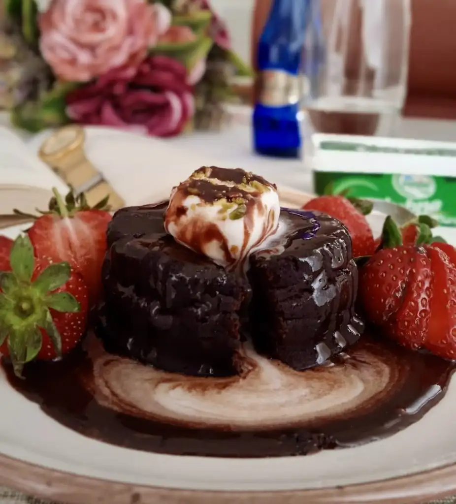 İçinin fazla akışkan olmasını istiyorsanız 190 derece fırında 8 dakika pişirin. Ama o bana biraz çiğ kalmış gibi geliyor. Fırında 10 dakika durursa daha rafadan bir kıvamı oluyor içinin. Fırından alıp dondurma ve meyveyle servis edebilirsiniz. Gerçi öyle dümdüz de yiyebilirsiniz. Paşa gönlünüz bilir. Herkese afiyet olsun.