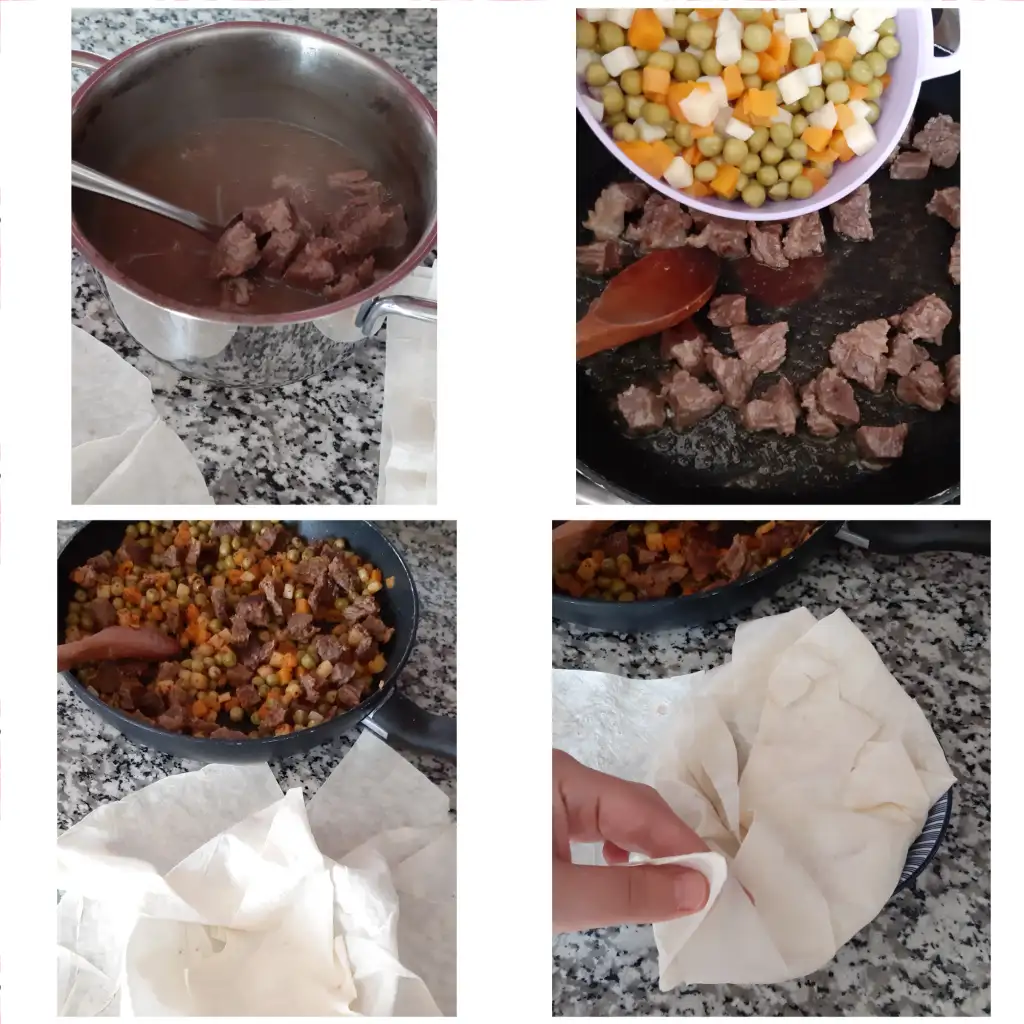 Önce etimizi haşlayalım. Sonra tavaya biraz tereyağ alıp haşlanmış etleri tereyağda kavuşalım, garnitür ve baharatları ekleyip biraz daha karıştıralım ve ocağın altını kapatalım.