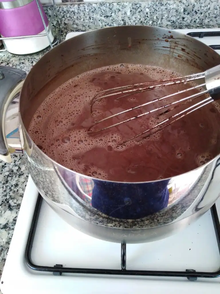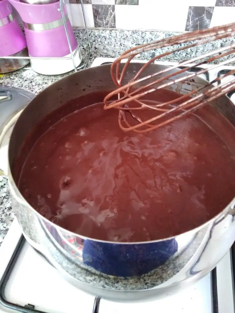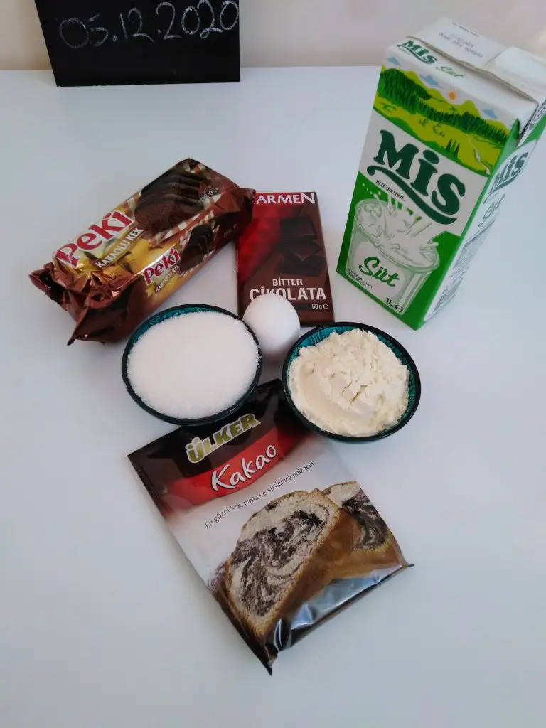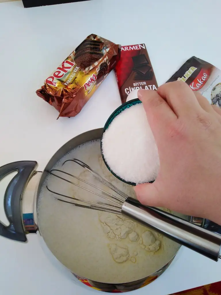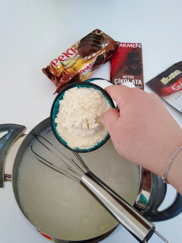 Öncelikle süt, un, şeker ve kakaoyu tencereye alıp şeker eriyinceye kadar karıştırıyoruz.