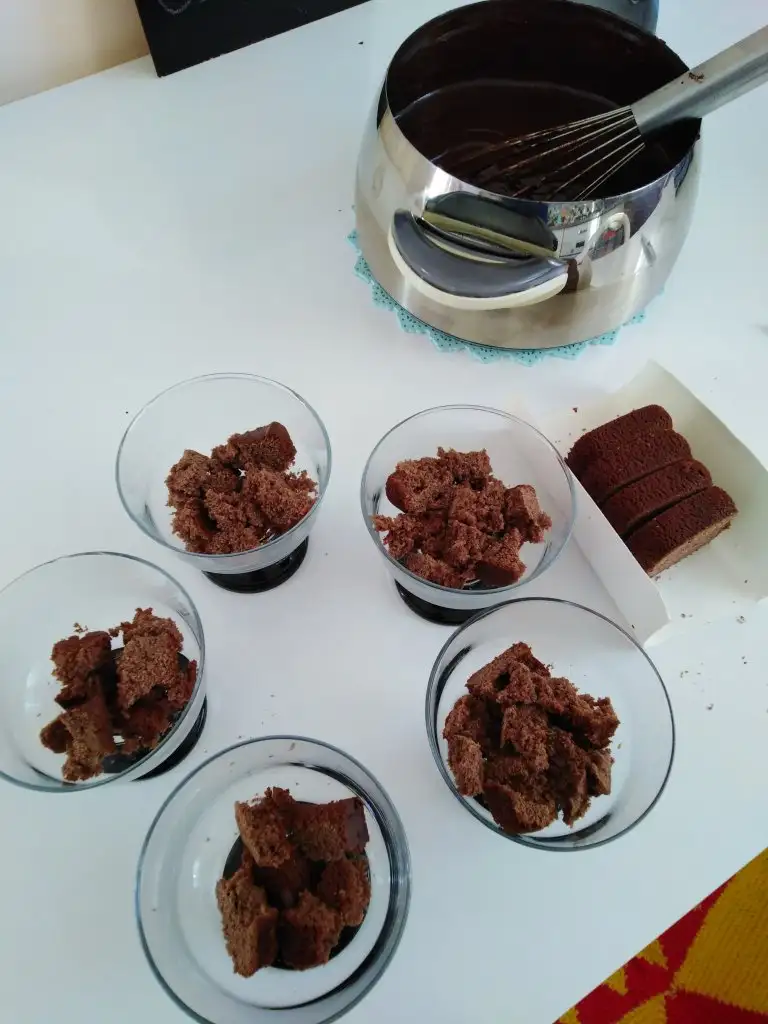Sonunda kabın dışını elimizle tutabileceğimiz soğukluğa ulaşınca kakaolu keklerimizi tabana koyduğumuz cuplara supanglemizi ekliyoruz ve soğuması için dolaba kaldırıyoruz.