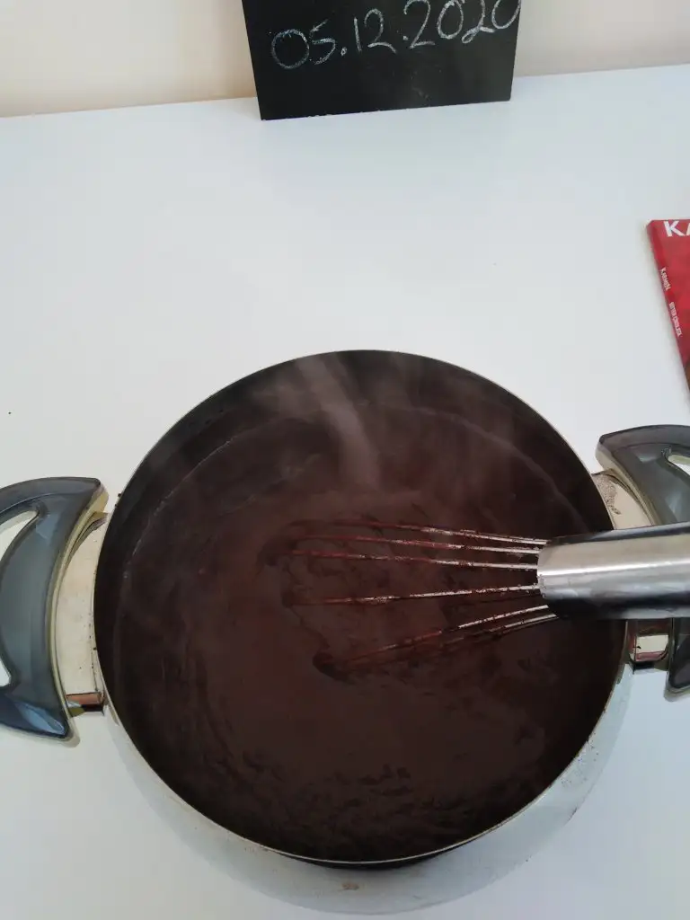 Öncelikle süt, un, şeker ve kakaoyu tencereye alıp şeker eriyinceye kadar karıştırıyoruz.