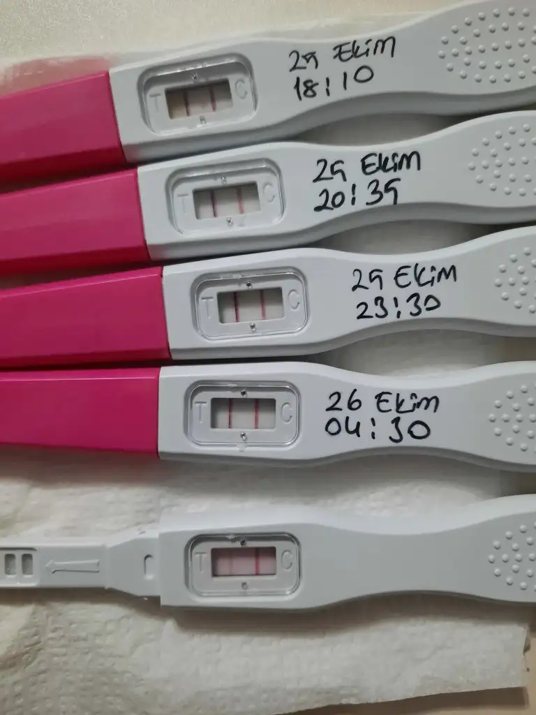 Kizlar gecen ay en son yaptığım testler bunlardı. 4.30 daki testi uykudan uyandıktan sonra tuvalete gitmiştim. 10 dakika sonra azcık 2. İdrarla yapmıştım. Oyuzden 4.30 daki test cok sağlıklı olmamış olabilir. Diğer en son silik olan testi de 6.30 da yapmıştım. İlk çift cizgiyi 25. Ekim akşam 22.00 da gordum sonra 26 ekim 1.00 gibide t daha koyuydu. Sizce benim hangi aşamada deneme yapmam gerekirdi