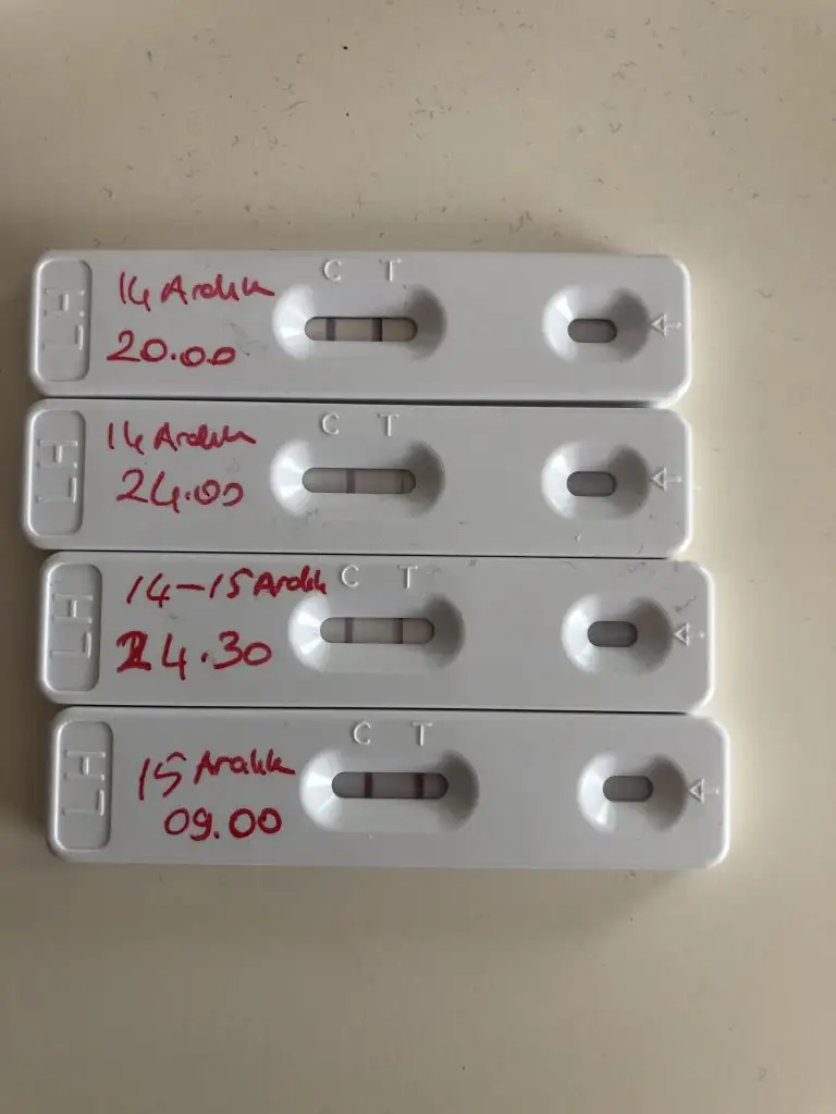 Kızlar dün akşam 20.00 de ultra pik oldu. Gece 24.00 te yaptım açılma var gibi tuhaf çıktı. Denesek mi ne yapsak bilemedim. 24.30 da bir daha test yaptım. resimdeki gibi gece açılacak gibi geldi. Sabah çocuğu okula bırak işe git yetişmez diye Gece 1.00 de denedik. Sabah kalktım ikinci idrarla 9.00 da yaptım bu şekilde idi. Sizce uygun zaman olmuş mu? Akşam acele mi ettim?