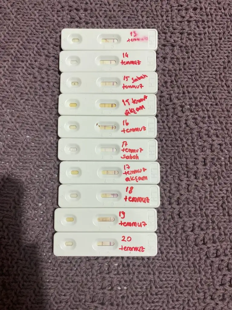 Sen bence bi gebelik testi al :))) ben de en son oyle ciktiginda allah wllah yumurtlamadim ya dedim hamileymisimmNisan ayında aşılama oldum tutmadı. Mayıs haziran temmuz başı normal adetimi oldum. Temmuzda adetim sadece 1 gün sürdü. Kan verdim 7 temmuzda negatifti. 13 temmuzda teste başladım hep koyu hep koyu normalde 20 Temmuz yumurtlama günüm olmalıydı hep pozitif çıkıyor
