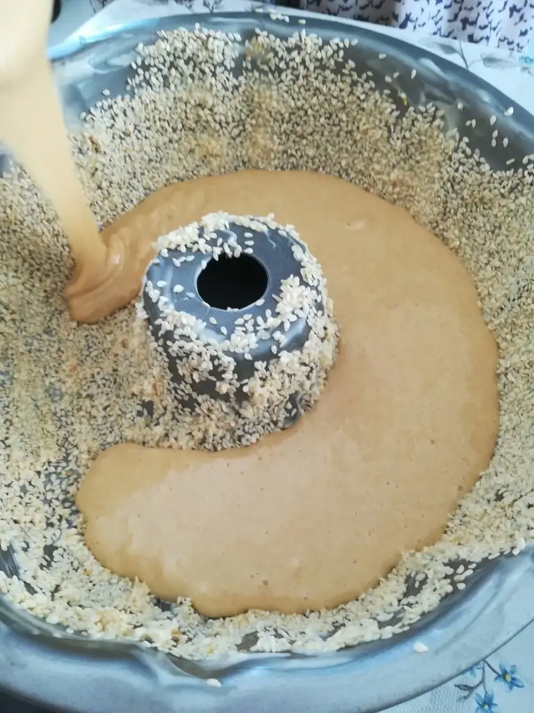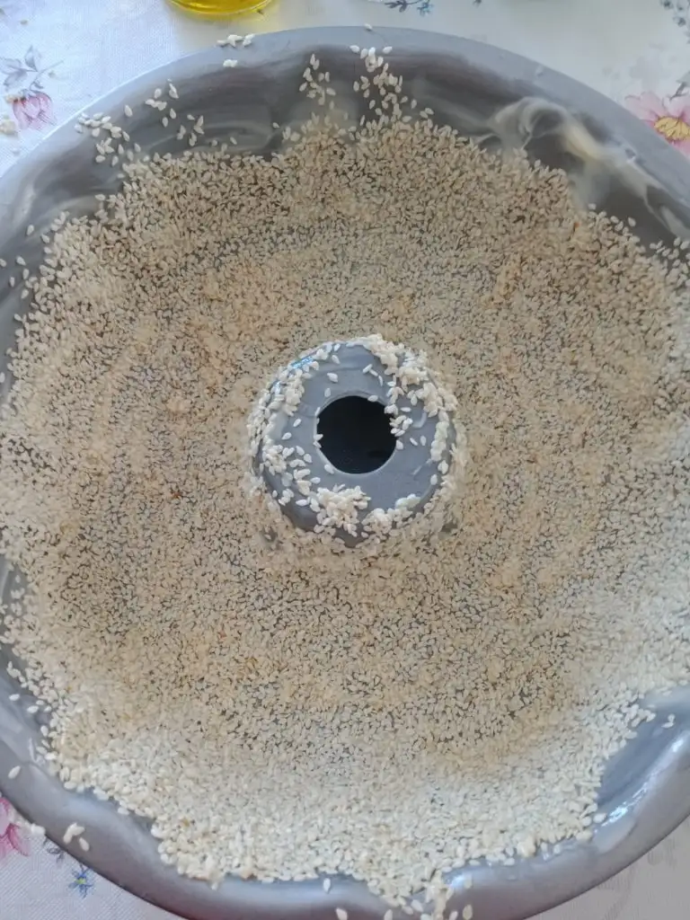 Kek kalıbı yağlanır ve kalıba susam dökülür.