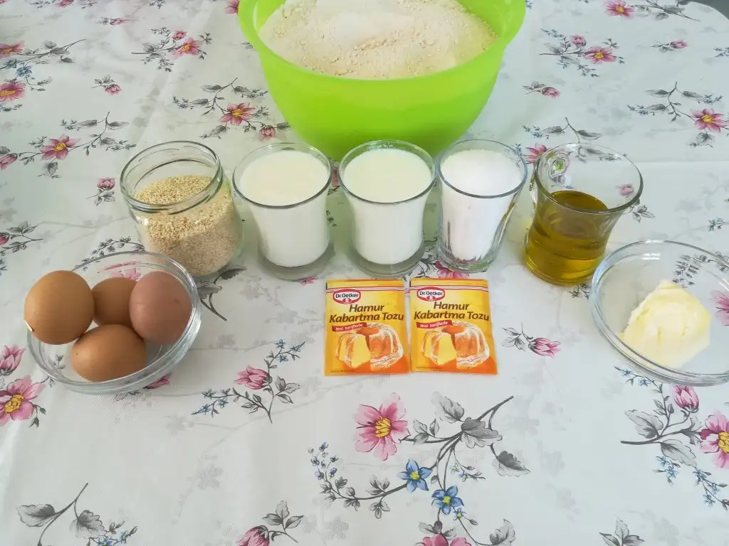 Derin bir kaba ılık süt, su, şeker ve mayayı ekleyin maya 5-10 dk bekletin. Ardından yağı ekleyin.