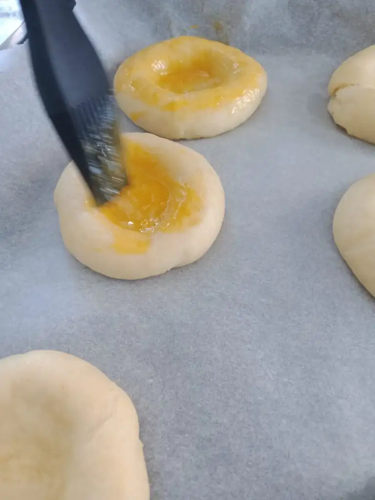 Mayalanan bezelere elinizle veya çay bardağının tabanını yağlayıp hamurun ortasına çukur açın.Üzerine yumurta sarısı sürüp susam serpiştirin.