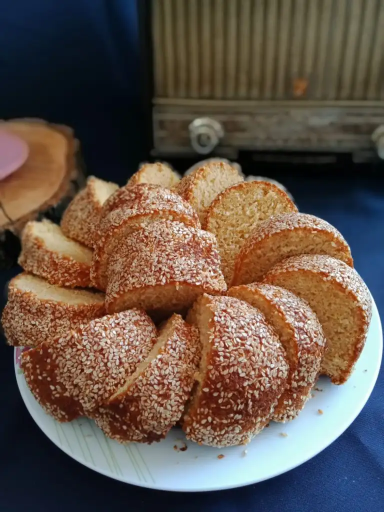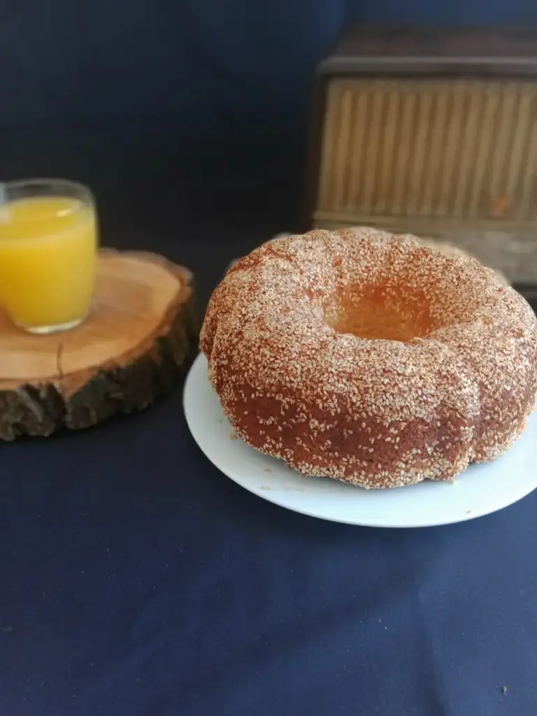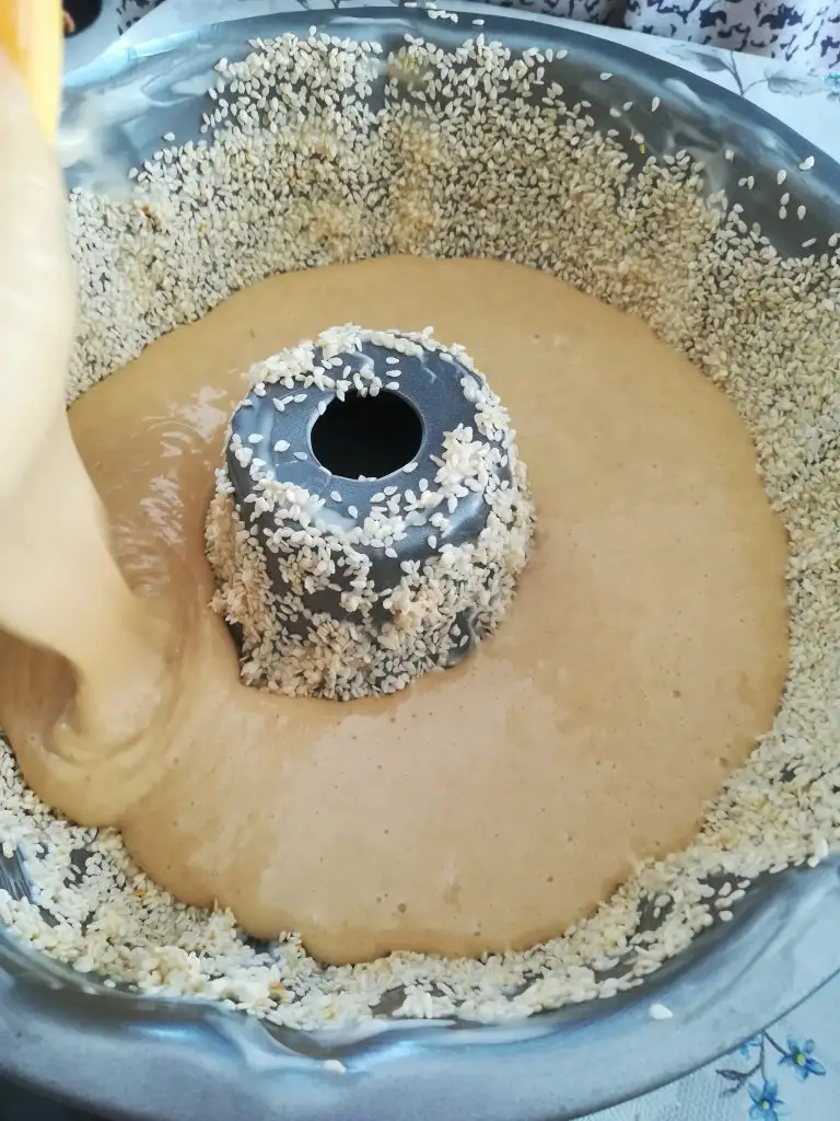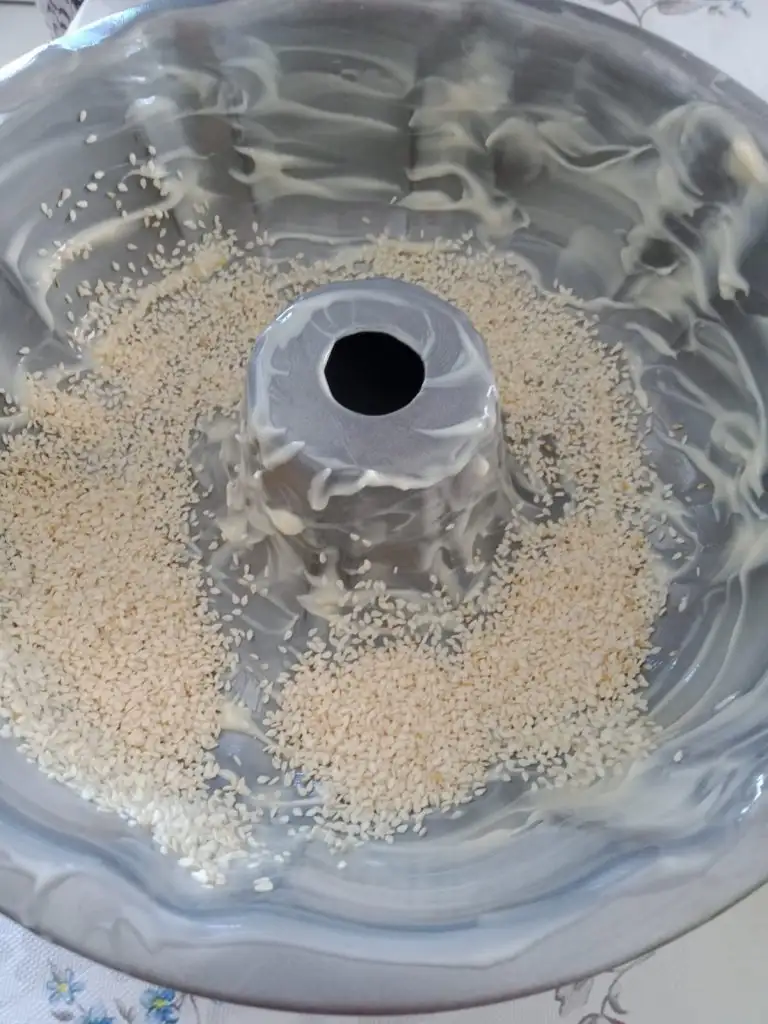 Kek kalıbı yağlanır ve kalıba susam dökülür.