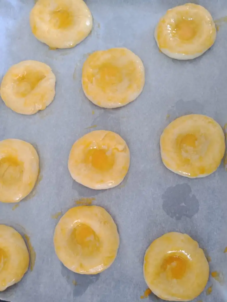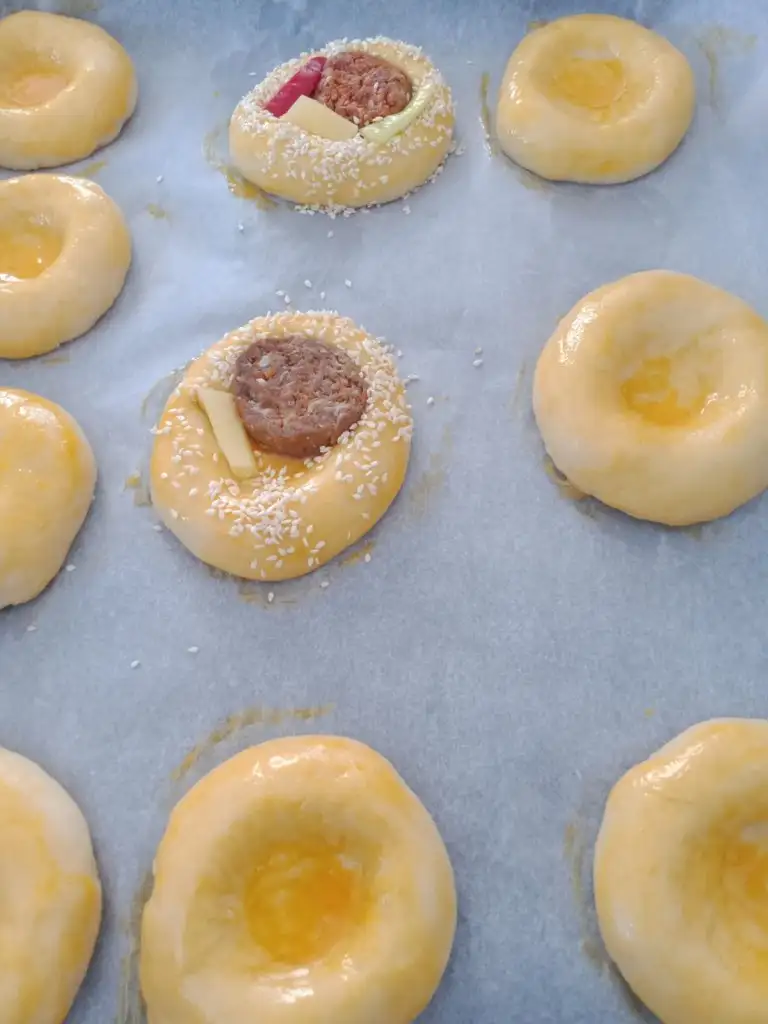Mayalanan bezelere elinizle veya çay bardağının tabanını yağlayıp hamurun ortasına çukur açın.Üzerine yumurta sarısı sürüp susam serpiştirin.
