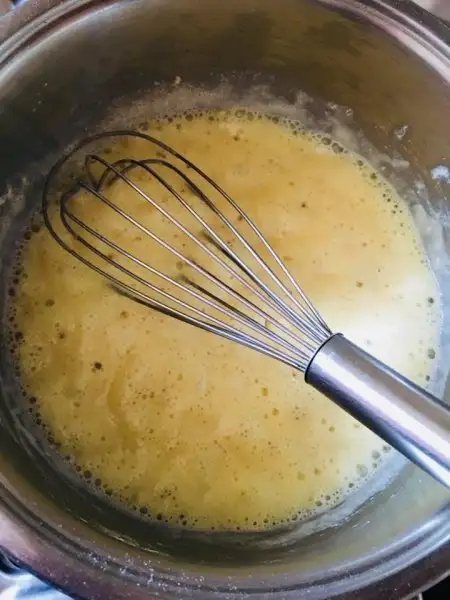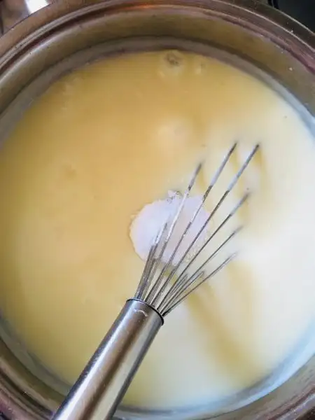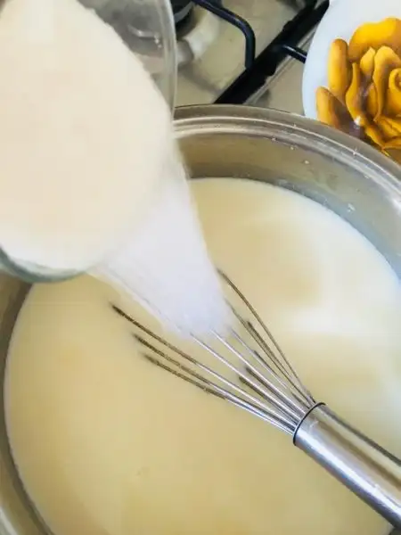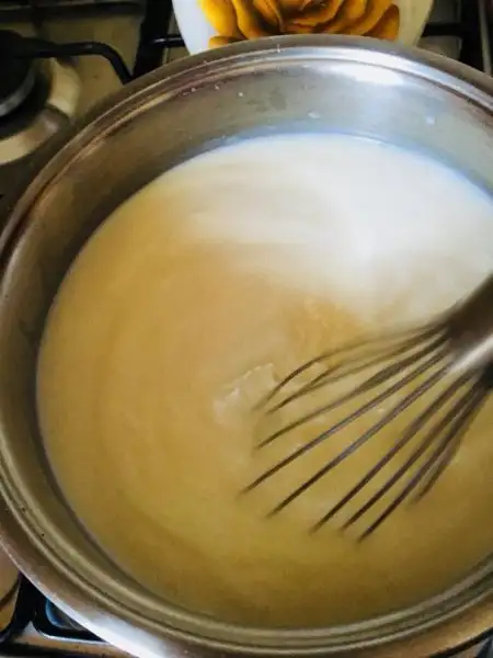 3 Ardından yavaşça sütü ekleyelim ve sürekli karıştıralım. Topak olmaması lazım bu yüzden sütü dikkatli ekleyelim.