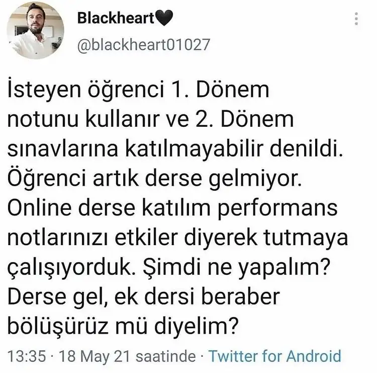 Çocuklar bu sene mağdur diye sınav seviyelerini o kadar düşürdük ki, o sınavlardan düşük almaları da ayrı bir dram. Milli eğitim müdürlükleri okul idarelerini uyarıyor bu konuda. Onlar da bizi tabii. İkinci sınava girseler yine kolay soracağız zaten ama yok. Hatta bu sınav duyurusundan sonra derse katılımlar da iyice azaldı. Öğretmenler olarak anlık modumuz ektedir: