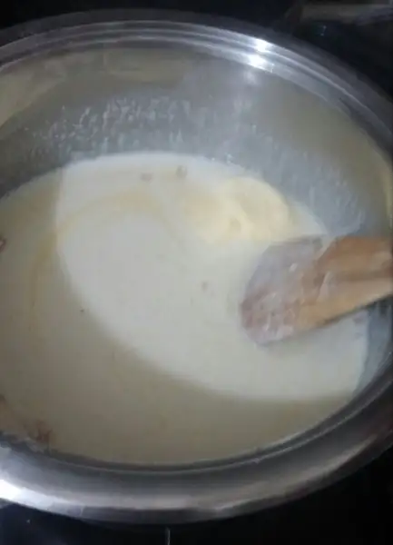 1 lt süt, şeker ve irmik ekliyoruz kısık ateşte sürekli karıştıralım. Kıvam alınca içine vanilya ve tere yağı ekliyoruz. Koyulaşıp göz göz olana kadar karıştırıp pişirelim.