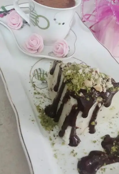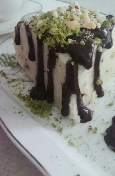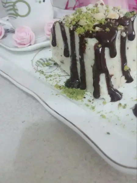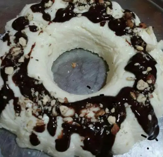 Ezilmiş fındıklarımızı ekleyip kek kalıbına dökelim silikonsa kek kalıbınız ıslatalım eğer değilse benim gibi yapışmaması için streç geçirelim . Buzdolabında 3 -4 saat soğutulur. Kalıptan çıkartıp tatlımızı fıstık ve çikolata sosu ile servis yapalım :) . Afiyet olsun.