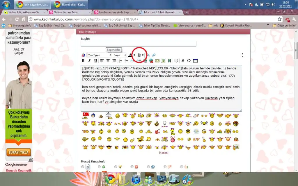 cevap yazıyorumya cevap yazarken yukarıda yazı tipleri kalın ince harf vb.simgeler var orada yuvarlak içine aldığım yere tıkla (resim ekliyorum senin için)