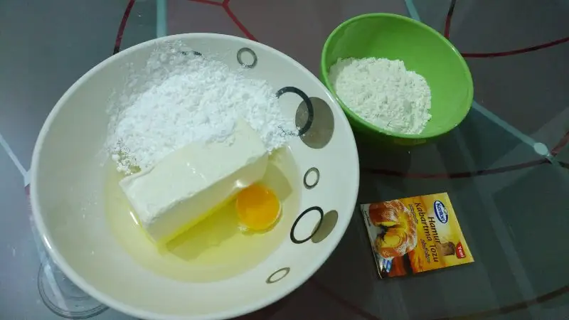 Un ve kabartma tozu hariç tüm malzemelerimizi yoğurma kabına alıp karıştırıyoruz. Unu azar azar ilave ediyoruz, kabartma tozunu da ekleyip hamurumuzu elde ediyoruz.