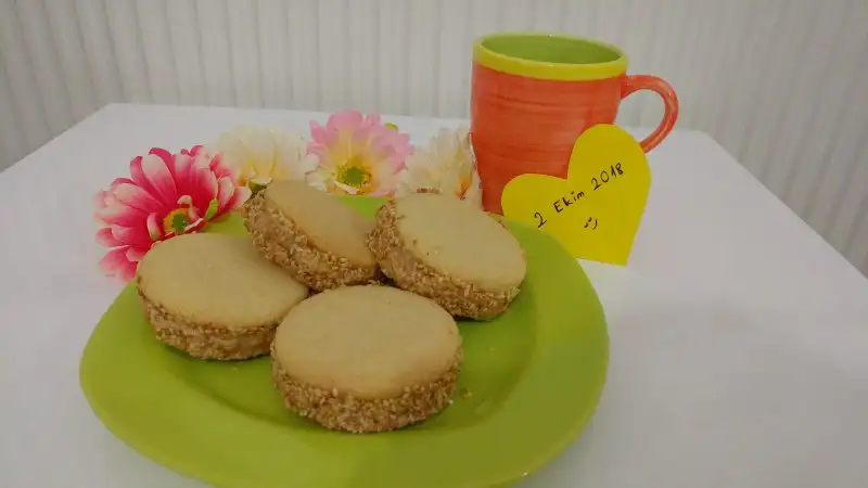 Pişmiş kurabiyemizin üzerine bir miktar tahinli karışımdan koyup üzerine başka bir kurabiye kapatıyoruz ve kenarlarını susama buluyoruz.