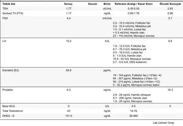 Kızlar zar zor adet olan biriyim ezelden beri. Çok defa tedavi oldum tedavi bitince hop başa dönüyor. Doğum kontrol hapı, inofolic, glifor-matofin, agnucaston hepsi denendi. 3.5 senelik evliyim 6 aydır çocuk istiyoruz ama ben de pko eşimde morfoloji 0, ileri hareketlilik de sıkıntı var. O tedavi sürecinde. Benimde doktorum hormonlarıma bakmak için adetin 3. Günü gel dedi. Son adet tarihim 8 Ağustostu. Pazartesi bir-iki damla kan geldi. Dün de aynı şekilde. Buna rağmen bugün gidip kan tahlili verdim. Az da gelse 3. Günü. Sonuçlar sağlıklı mıdır bu miktarda kanama için bilemedim. Tahlil sonuçlarım bu şekilde. Sizce normal mi? Cevaplayan herkese teşekkürler