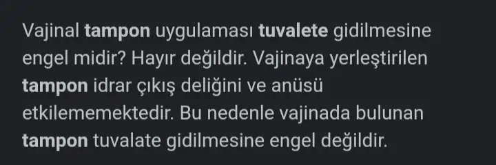 Aynen siz haklısınız. Tampon varken isemesinler diye arkadaşları da uyardım. Biz diğer kadınlar biraz cahiliz de kusura bakmayın.Öncelikle belirtmek isterim ki tampon varken idrar yapılmaz, en başta hijyenik değil. Ama siz kabul etmemekte ısrar ediyorsunuz hahahabir kere fizik kurallarına bile aykırı bir durum. Keza idrarla şişen bir tampon kayar zaten ve dediğim gibi tekrar ediyorum o basınçla da düşer. Hadi onu geçtim büyük tuvalet bile yaparken ıkınma yaşarsanız yine kayıp düşme payı var. Yani bunları anlatmak durumunda kaldığım için inanınki çok şaşkınım ama siz neden sonuç ilişkisi kurma yetisine sahip gibi görünmüyorsunuz yorumlarınızdan sebep.