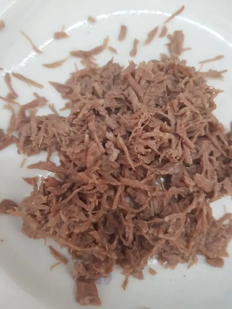 Önce etlerimizi düdüklü tencereye koyup üzerine suyumuzu ekliyoruz etler iyice yumuşayıp kolayca parçalansın diye 1 saat haşlıyoruz haşlama süresinin sonunda etleri çıkarıp güzelce didikliyoruz.