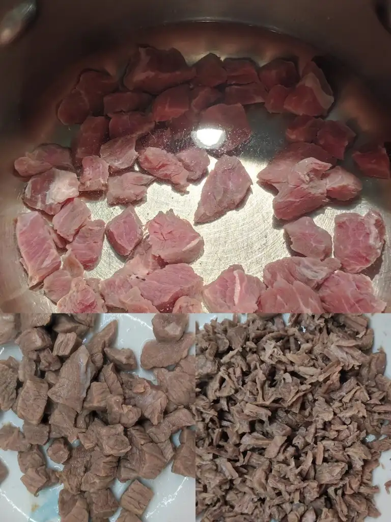 Önce etlerimizi düdüklü tencereye koyup üzerine suyumuzu ekliyoruz etler iyice yumuşayıp kolayca parçalansın diye 1 saat haşlıyoruz haşlama süresinin sonunda etleri çıkarıp güzelce didikliyoruz.