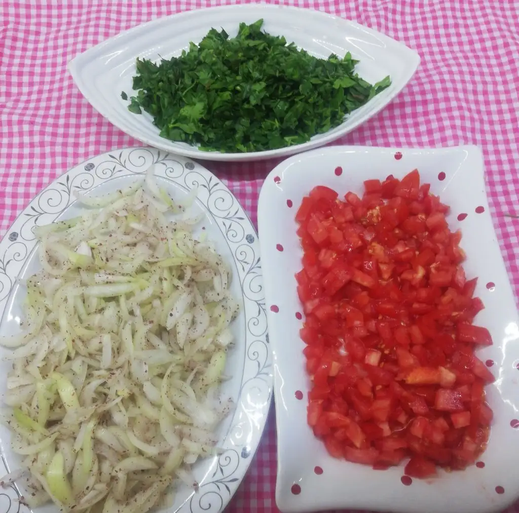 Etlerimiz haslanirken domatesimizi ,maydonozumuzu ufak ufak kesiyoruz.
