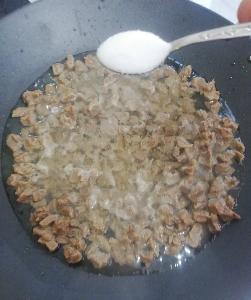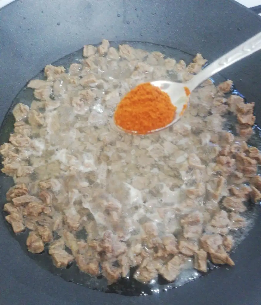 Sacimiza yagimizi ve suyu koyup kizmasini bekliyoruz kızan yağa haşladığımız eti,tuzu ve kırmızı toz biberimizi atıp bir iki tür karıştırıp pişiriyoruz.