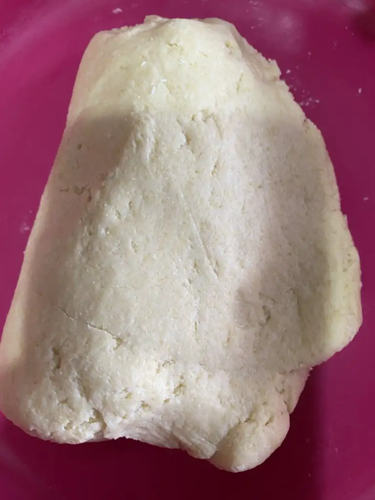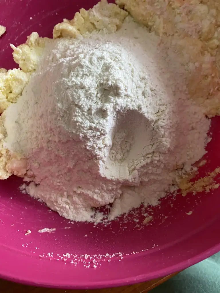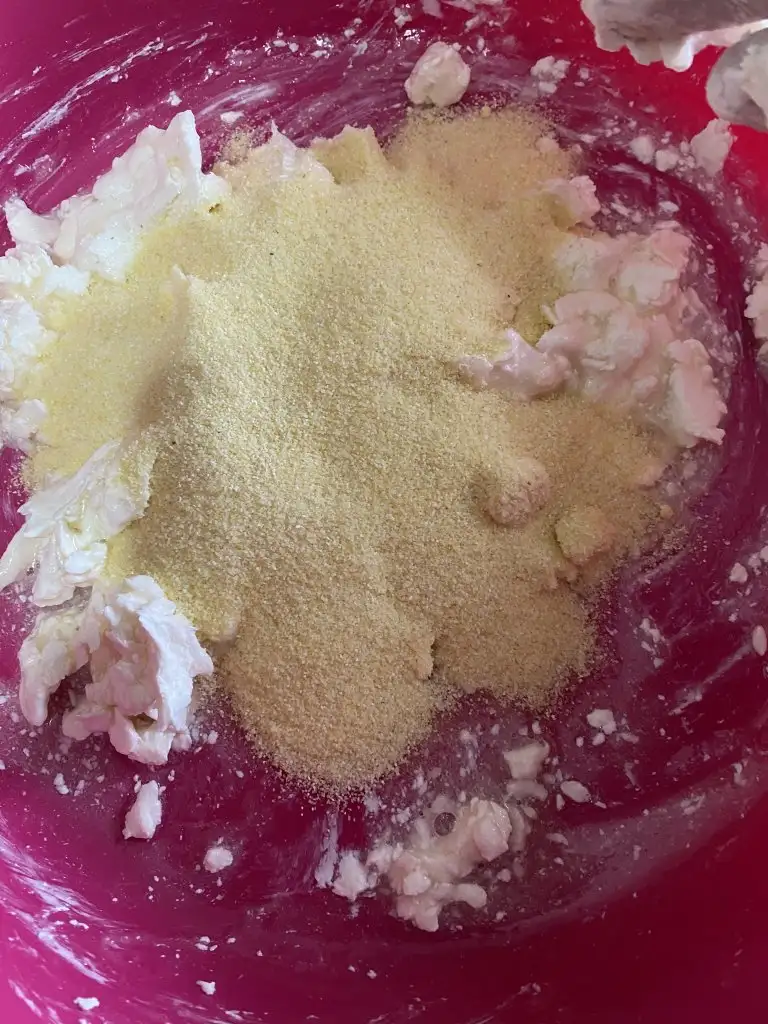 Ardından irmik, un ve kabartma tozunu ekleyip, kulak memesi yumuşaklığında bir hamur elde ediyoruz.