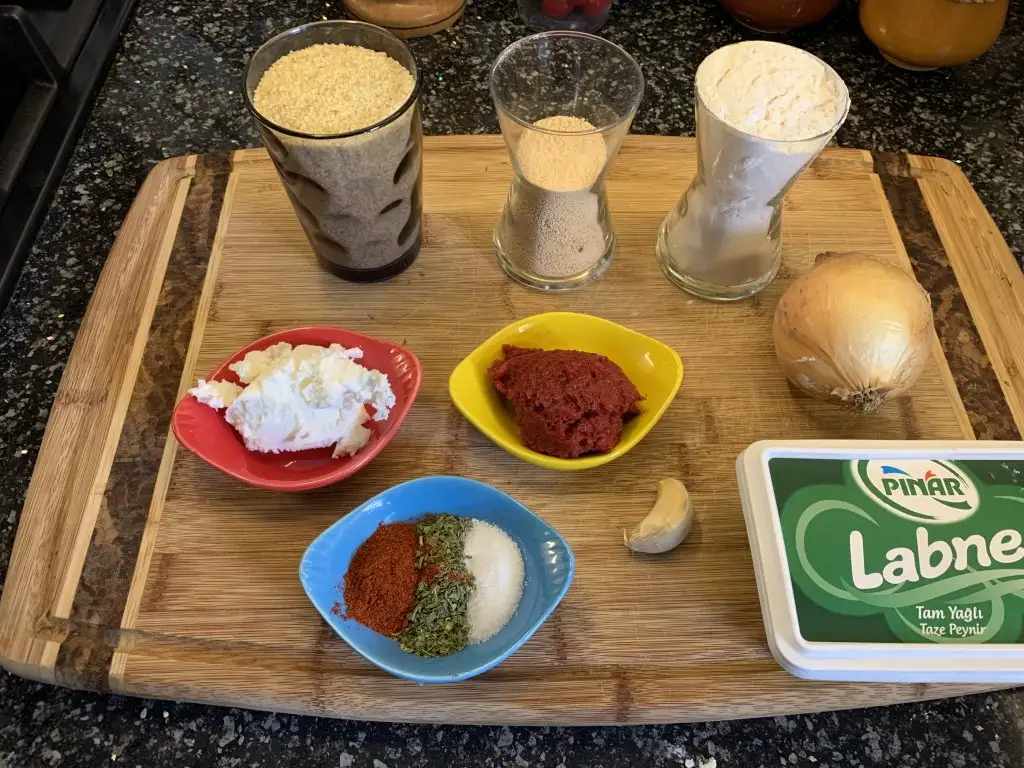1- İnce bulguru 2 su bardağı sıcak suyla ıslatıp üzerini kaparak 15 dk şişmesi için bekleyin. Sonra tarhanayı, unu ,salçayı, soğanı, sarımsağı, tuzu ve baharatlarını bulgura ekleyip 10 dakika kadar macun kıvamına gelene dek yoğurun. Eğer bulgurunuz hala kuru ise biraz daha sıcak su ilavesi yapabilirsiniz.