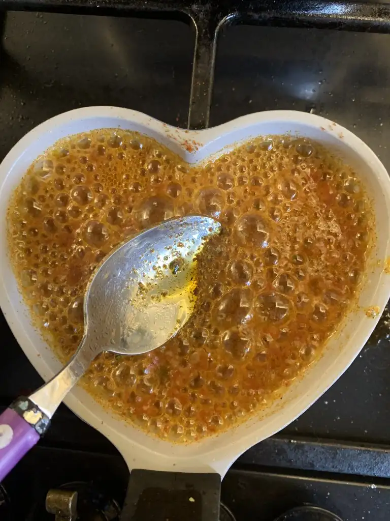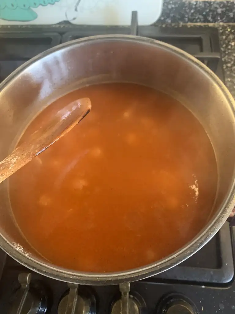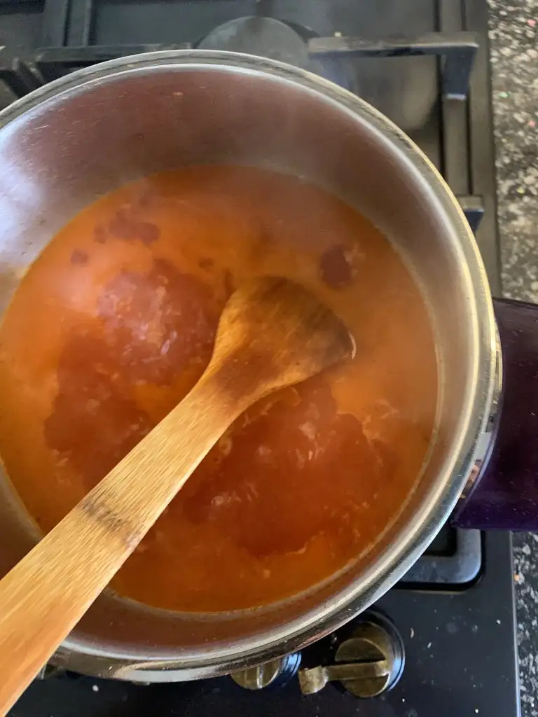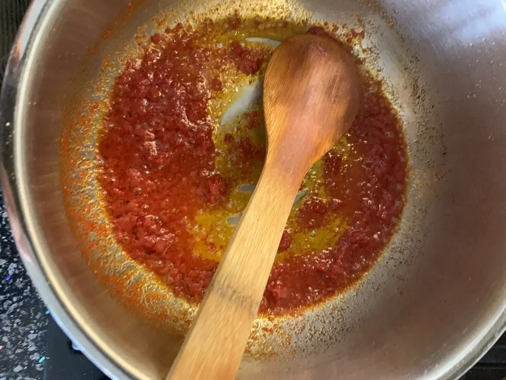 3- Tereyağı, sıvı yağ ve salçayı derin bir tencereye alıp 5 dakika kavurduktan sonra sıcak suyu ve tuzu ekleyin.