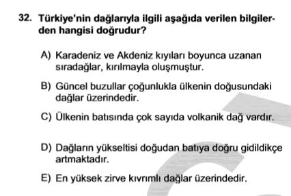 cnm daglar doguda daha yuksek, ege kırılma daglarıdır yani horst ve grabenden olusur, volkanık dağlar da doguda en çok, buzullarda yükseltisi en çok olan yerde yani doguda yer alır. e yada b dedim ama ben olsam b derdim:)