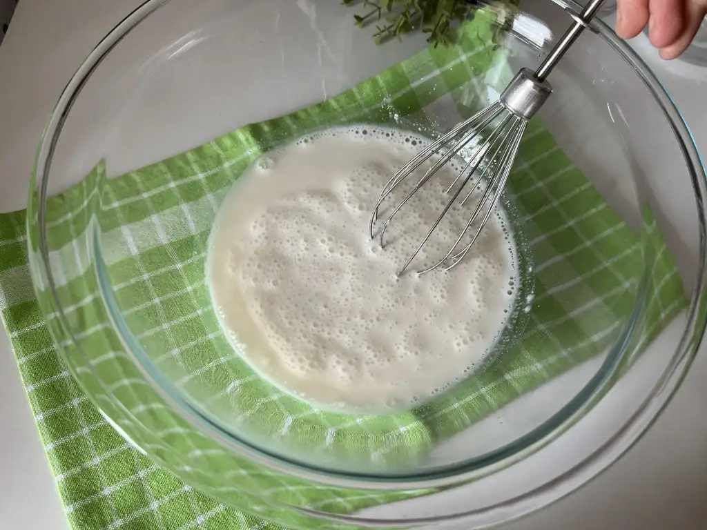 Sütü,suyu kaba alalım. Üzerine unu,şekeri,tuzu ve kabartma tozunu ilave edip karıştıralım.