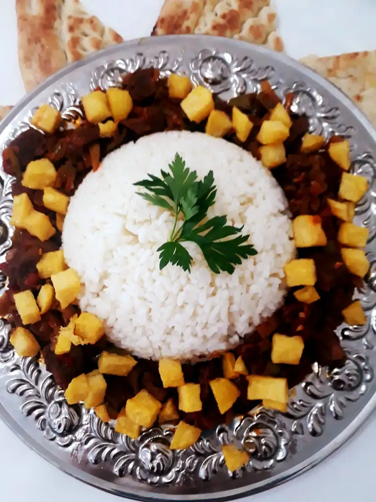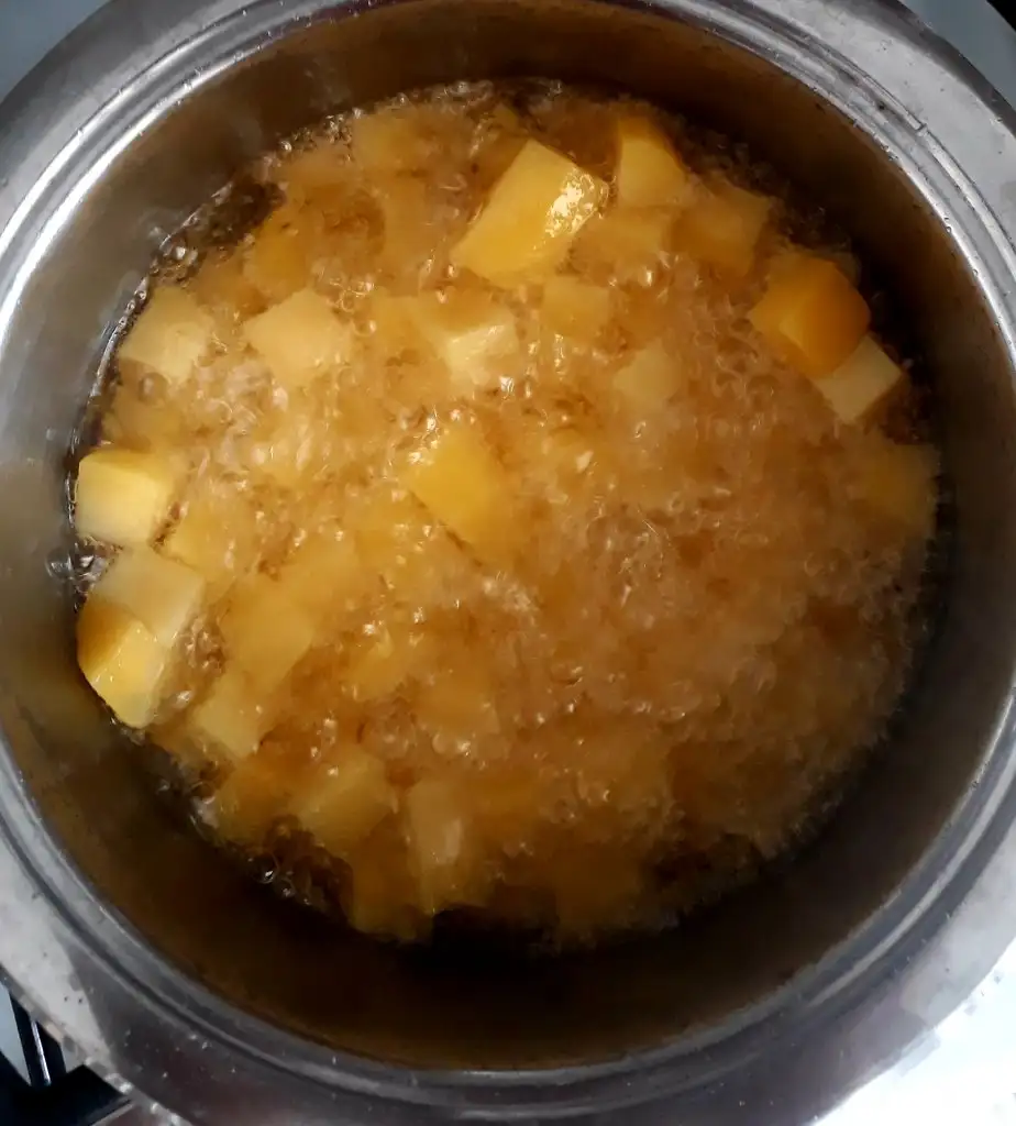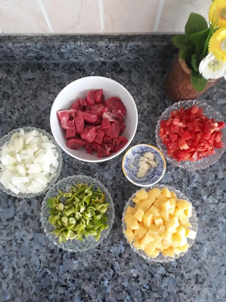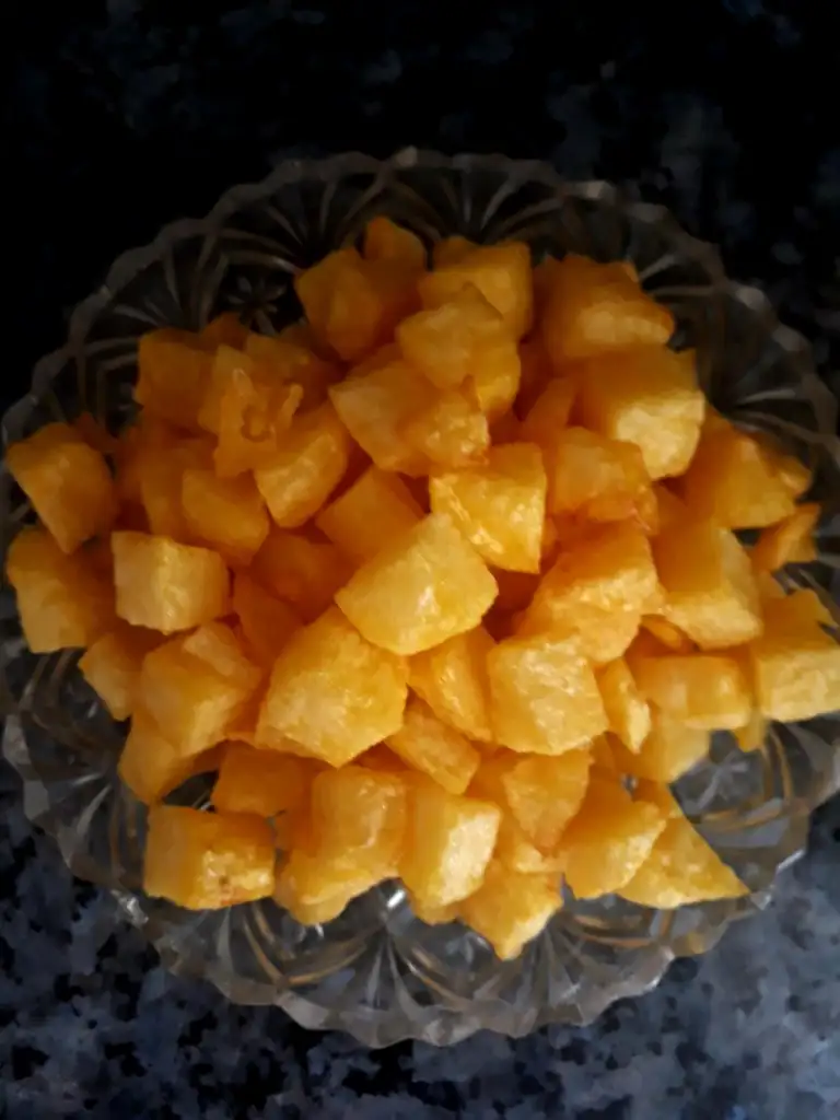 Etlerimizde kaynarken küp küp doğradığımız patayeslerimizi kızartıyoruz. Ve sunumlarken yemeğimize ekliyoruz.