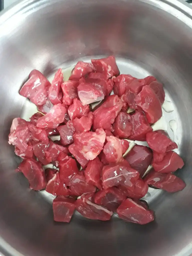 Etlerimizi tencereye kouyoruz. Üzerine 4 yemek kaşığı sıvı yağ ekleyiyoruz.