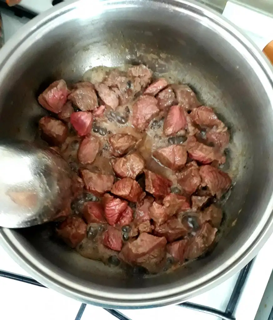 Etlerin rengi değişip suyunu salınca üzerine 1 bardak daha sıcak su ekleyip suyunu çektiriyoruz.