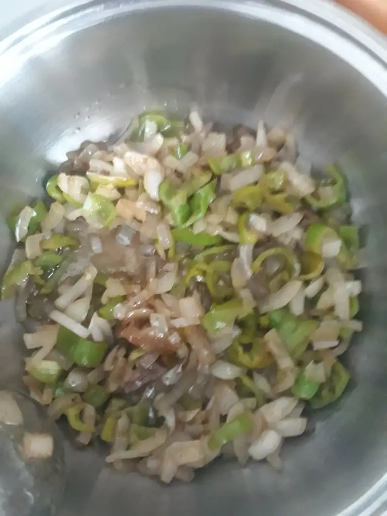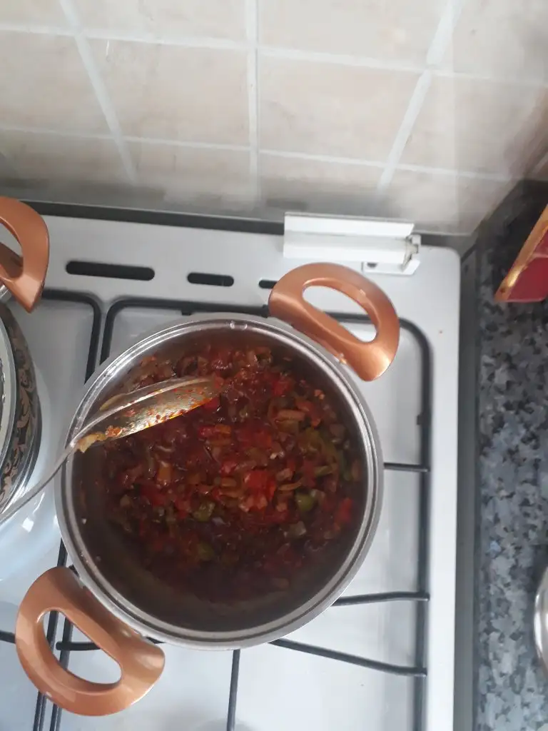 Etimiz kısık ateşte suyunu çekip pişerken diğer tarafta soğanı ve biberimizi kavuruyoruz.