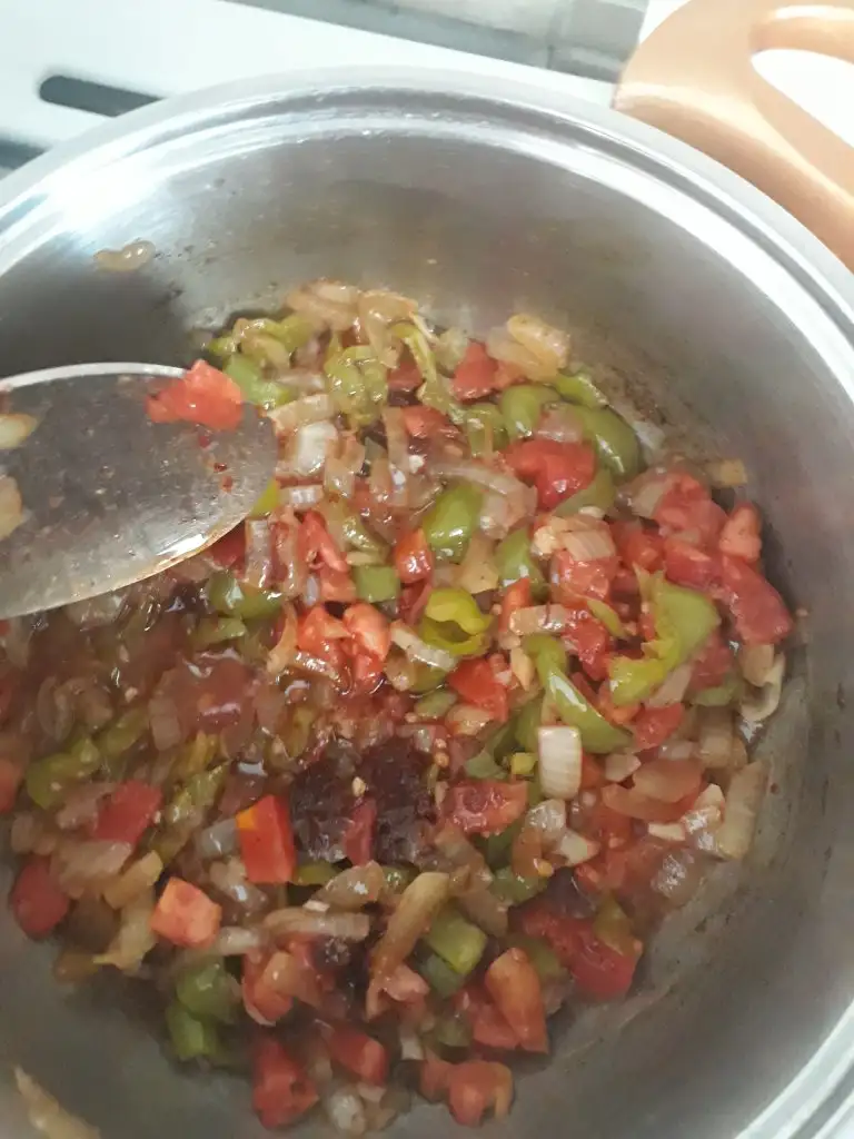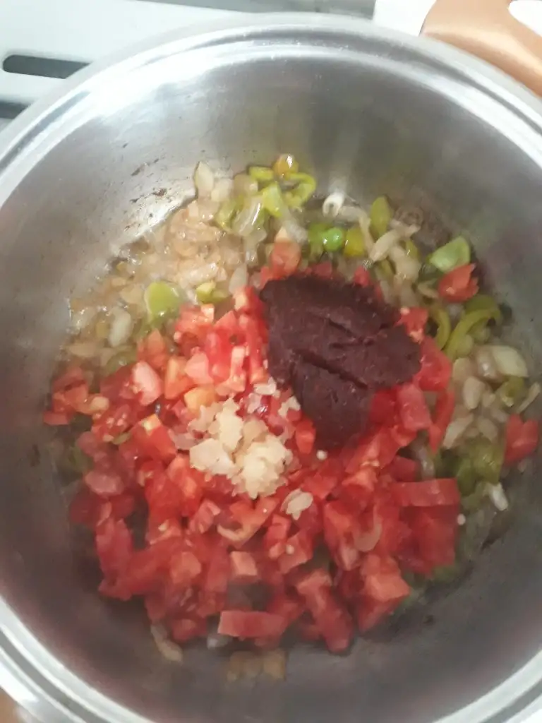 Soğan ve biberlerin rengi değişince üzerine domates ,sarımsak ve salçamızı ekliyoruz.