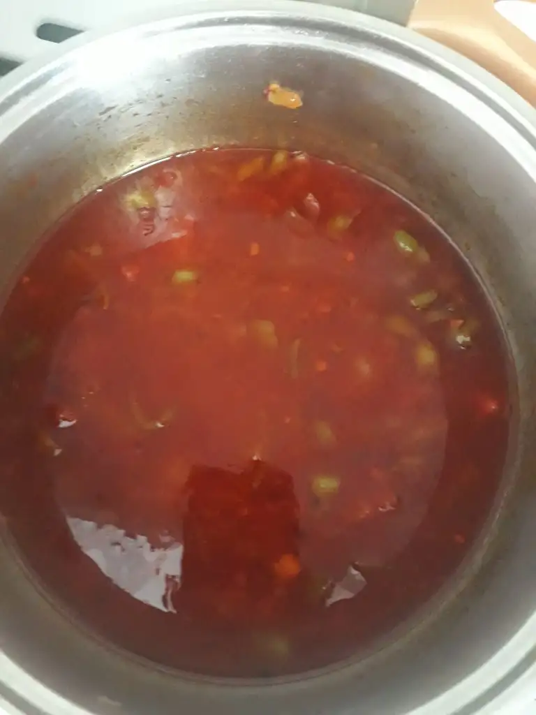 Domatesler de pişince üzerine 1,5 bardak sıcak su ,tuz,karabiber ekleyip 10 dk kaynamaya bırakıyoruz.