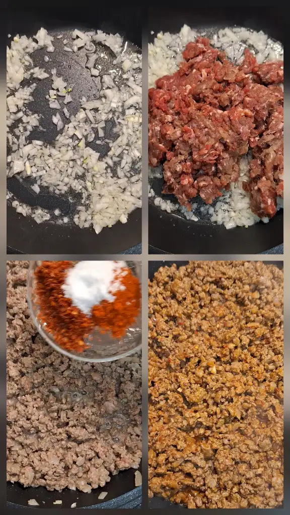 Bir tavada yağı kızdırıp kıymayı ekleyin. Kıyma suyunu çekip rengi dönene kadar kavurun.