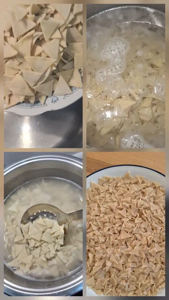 Kesilen hamurları bol tuzlu kaynar suda haşlayın (hamurlar suyun yüzüne çıktığında pişmiş demektir). Süzüp servis tabağına yayın.