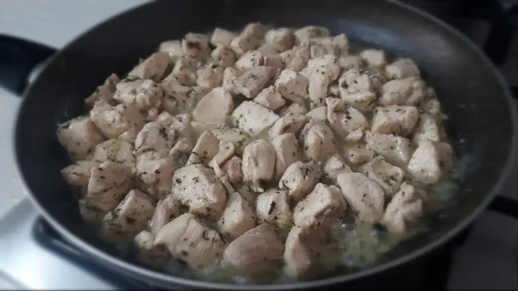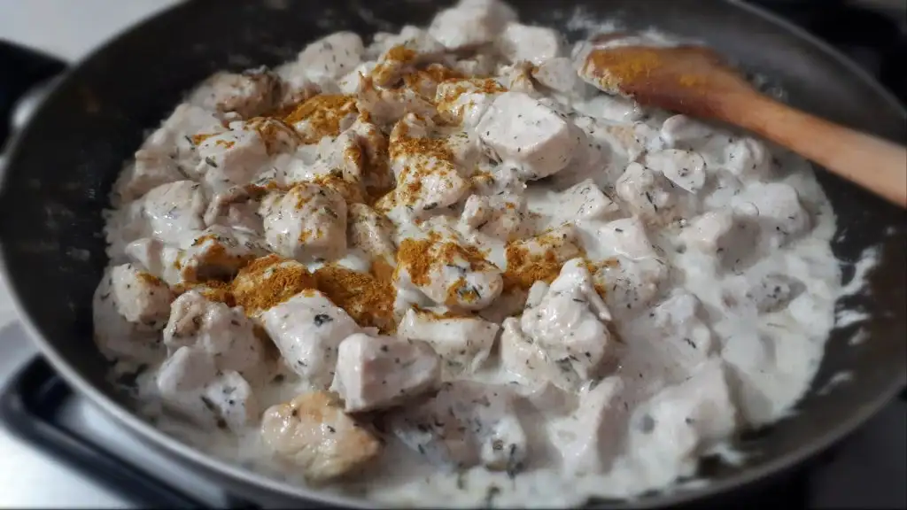 - Tamamen kızaran tavuklarımızın üzerine kremanin nyarisini ve kaşarımızı koyup kıvamı koyulaşana kadar pişirelim. (Ben kasar eklemeyi unutmusum