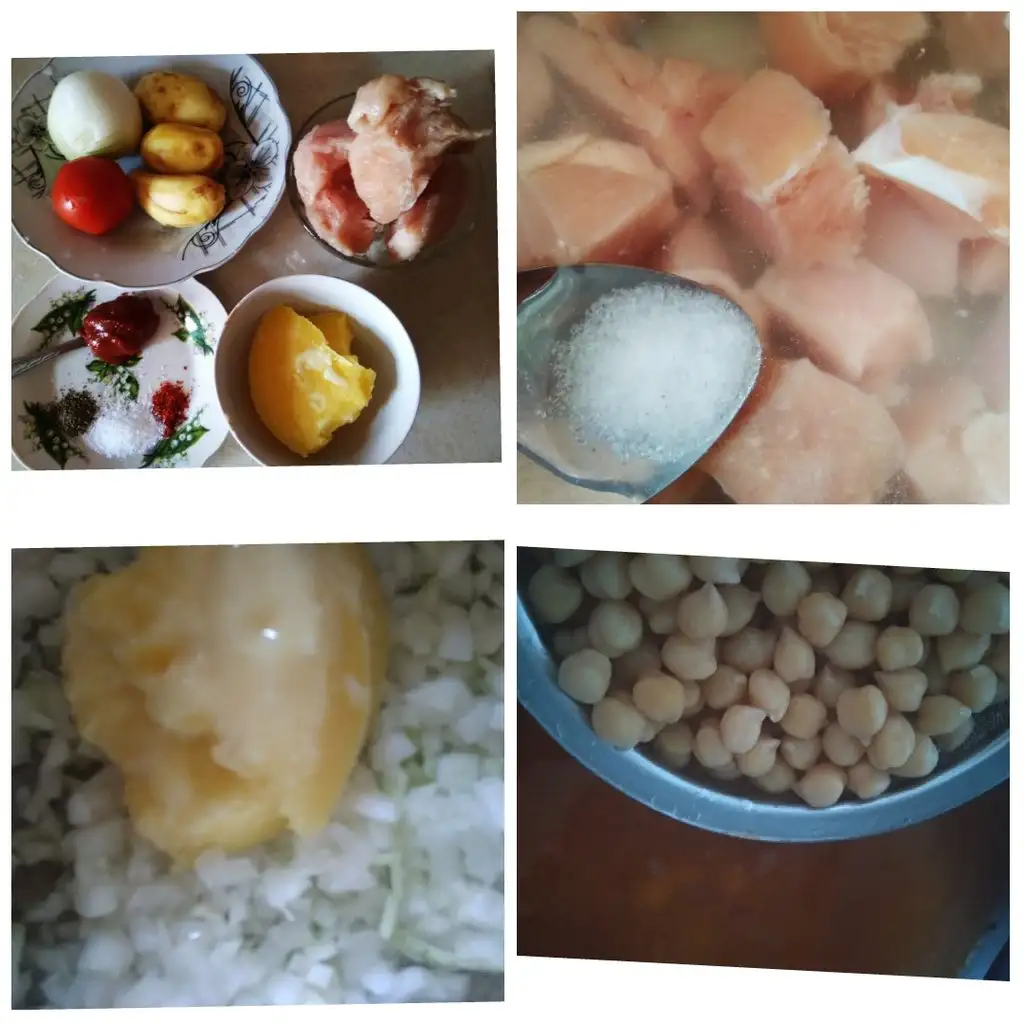 Sonra digər malzemleri dokuyoruz duz kara biber pul biber də ekliyoruz 5dakdan sonra tavuk gogsunden haşladığımız suyu ve 1 su bardağı da filtire suyu töküb kisik atesde pismeye koyurk