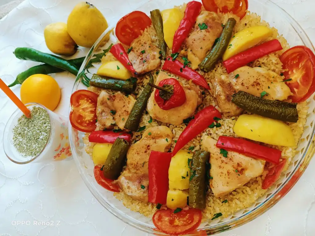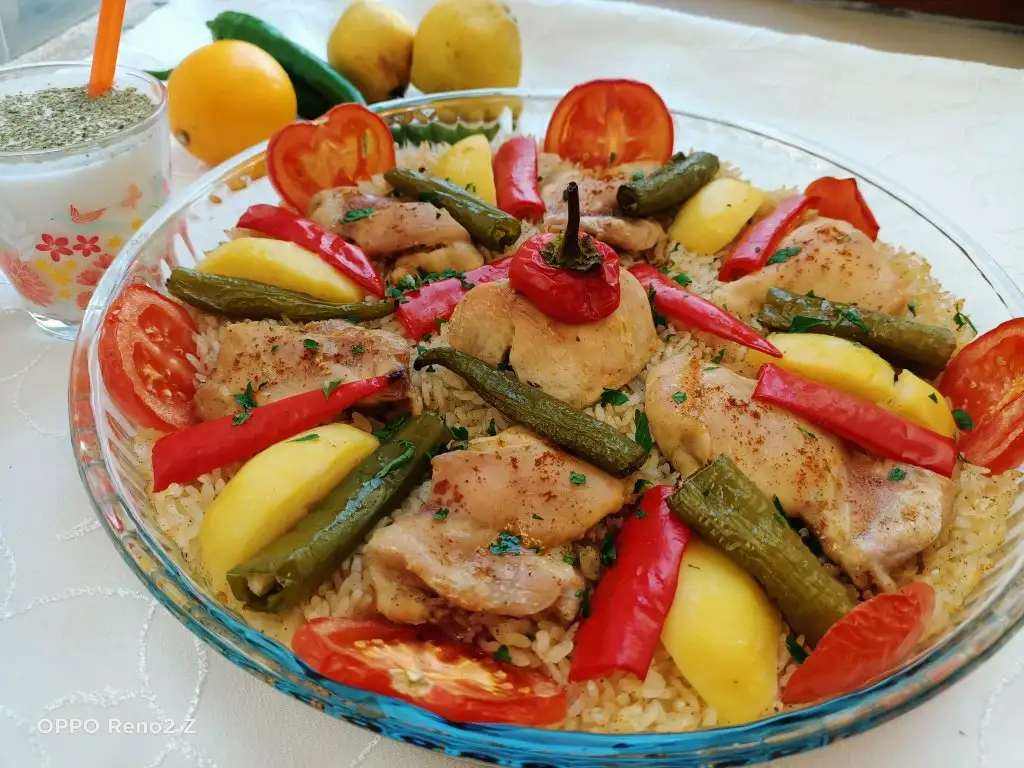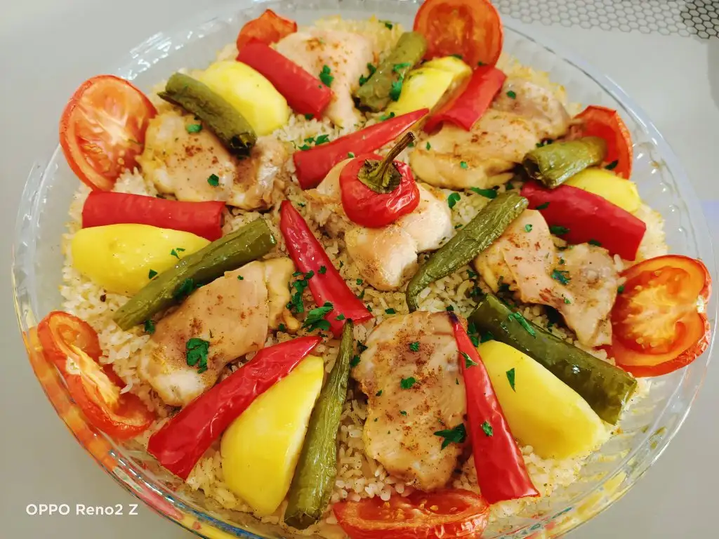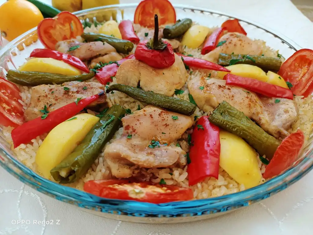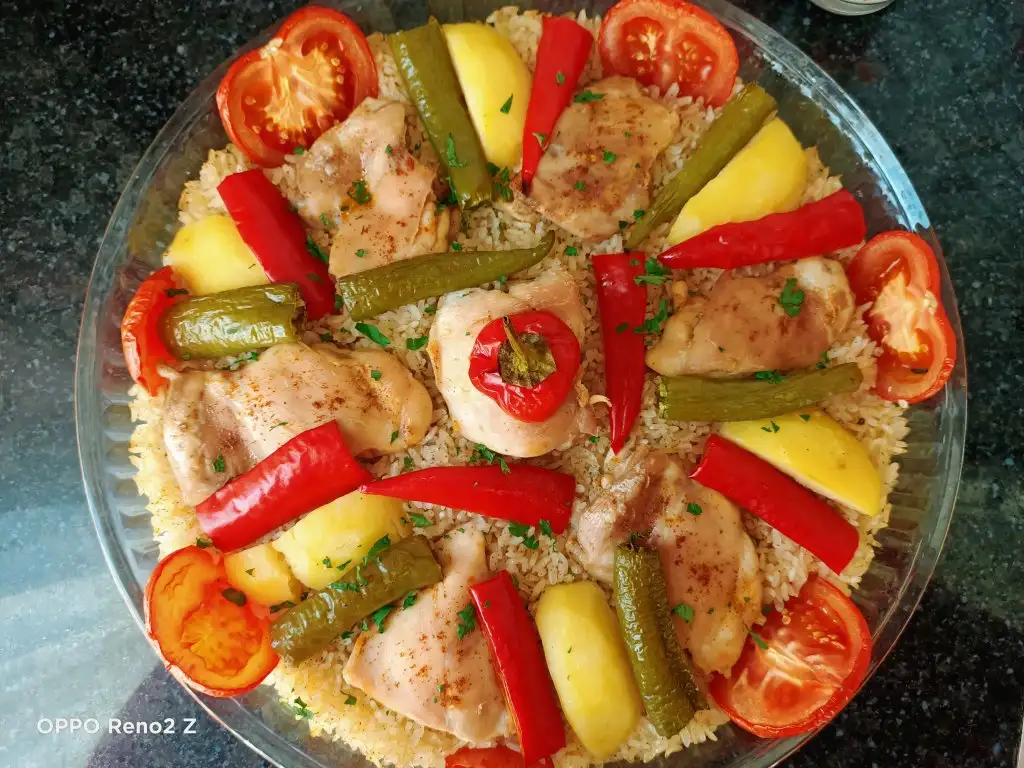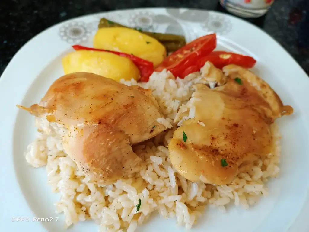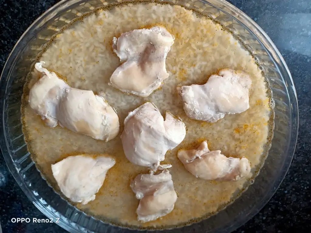 Öncelikle tavukları haşlıyoruz. Bu arada pirinci sıcak ve tuzlu suda yarım saat bekletiyoruz. Tavuklar haşlanınca süzüp suyunu kenarda bekletiyoruz. Sıvıyağ ve tereyağında pirinçleri birkaç dakika kavuruyoruz, üzerine tuz ve baharatları ekleyip karıştırıp altını kapatıyoruz. Borcama pirinçleri ince bir şekilde yayıyoruz, üzerine tavukları diziyoruz. Suyunu da koyup üzerini ıslattığımız yağlı kağıtla kapatıyoruz. Pirinçlerin kurumaması için bu şekilde yapmak daha iyi oluyor. Önceden ısıtılmış 180 derecelik fırında kontrollü olarak 25-30 dakika pişiriyoruz. Üzerine patates, biber, domates koyabilirsiniz.