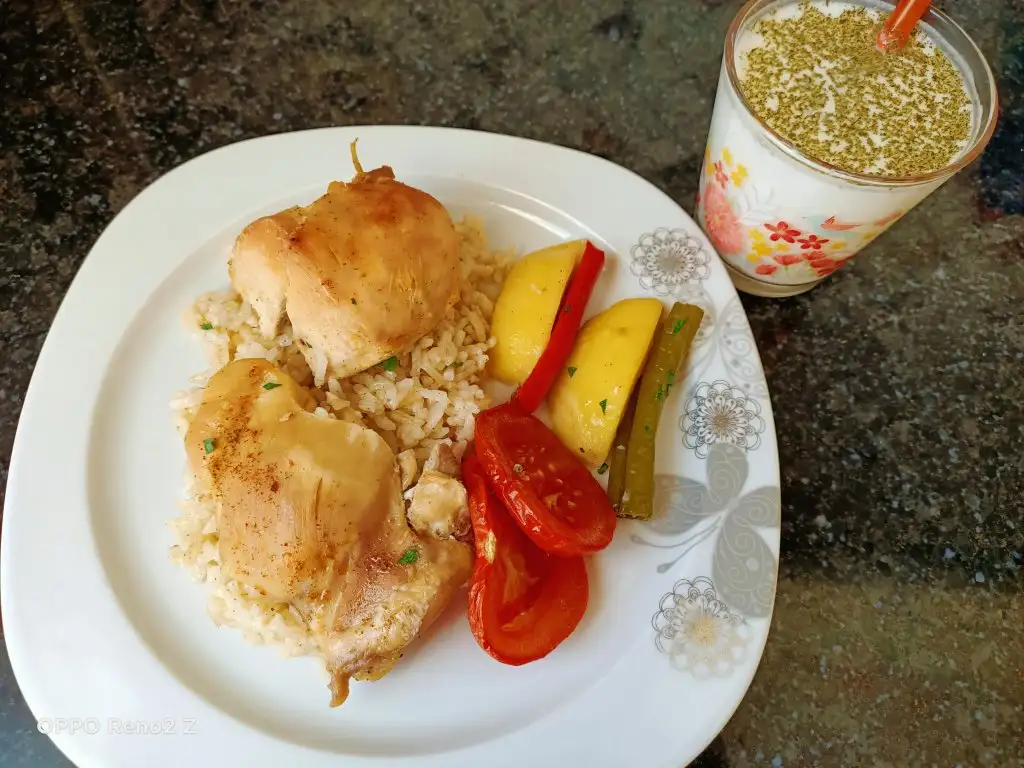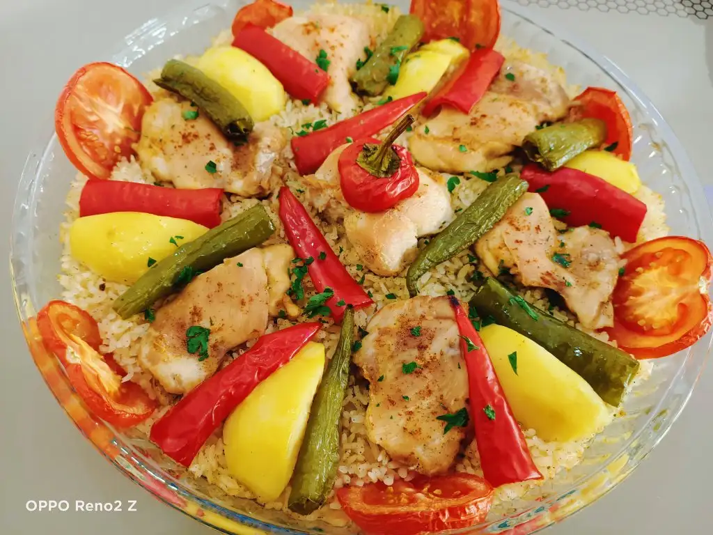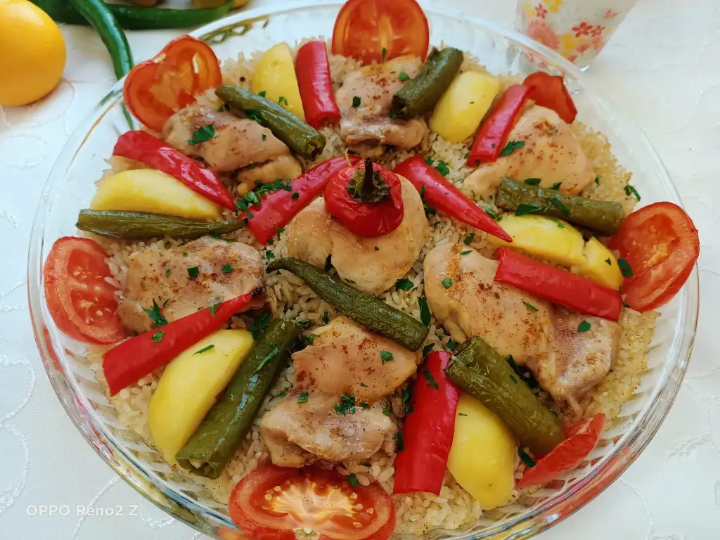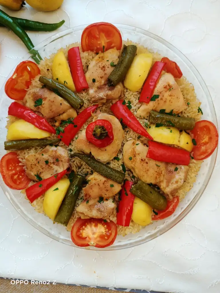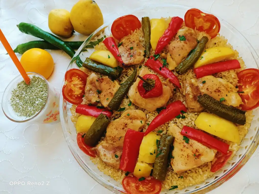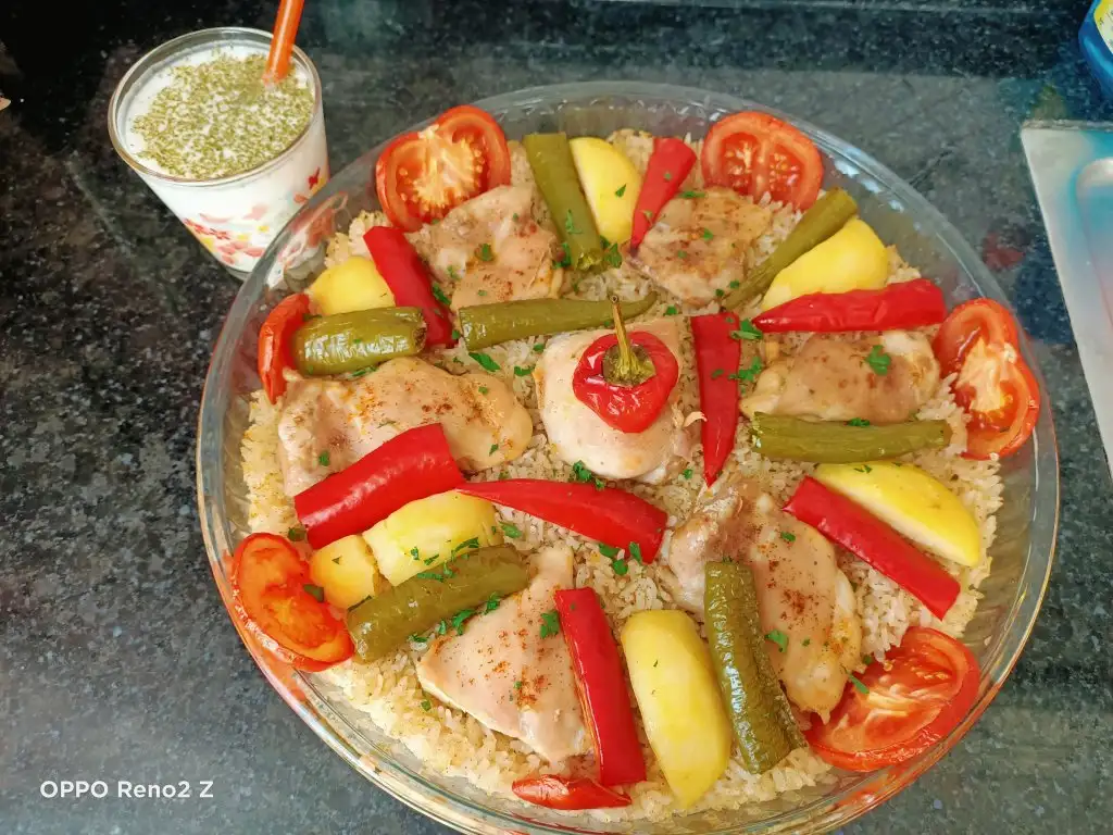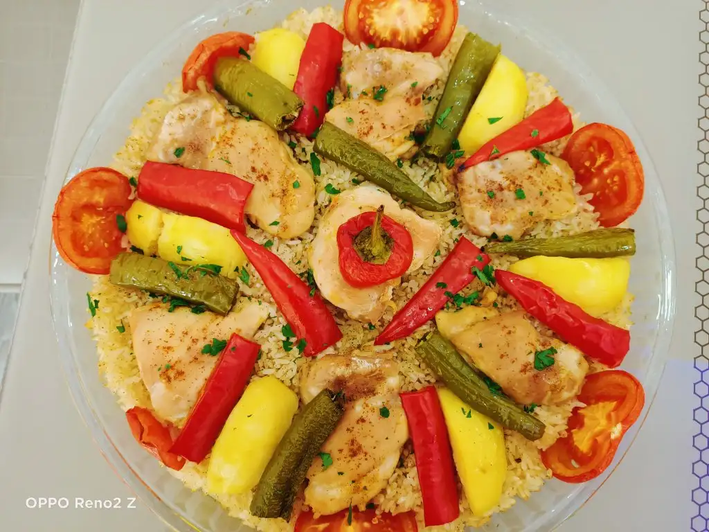 Öncelikle tavukları haşlıyoruz. Bu arada pirinci sıcak ve tuzlu suda yarım saat bekletiyoruz. Tavuklar haşlanınca süzüp suyunu kenarda bekletiyoruz. Sıvıyağ ve tereyağında pirinçleri birkaç dakika kavuruyoruz, üzerine tuz ve baharatları ekleyip karıştırıp altını kapatıyoruz. Borcama pirinçleri ince bir şekilde yayıyoruz, üzerine tavukları diziyoruz. Suyunu da koyup üzerini ıslattığımız yağlı kağıtla kapatıyoruz. Pirinçlerin kurumaması için bu şekilde yapmak daha iyi oluyor. Önceden ısıtılmış 180 derecelik fırında kontrollü olarak 25-30 dakika pişiriyoruz. Üzerine patates, biber, domates koyabilirsiniz.