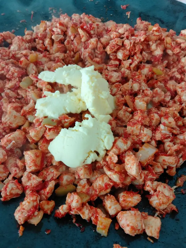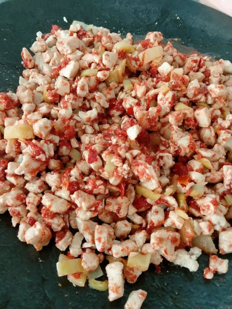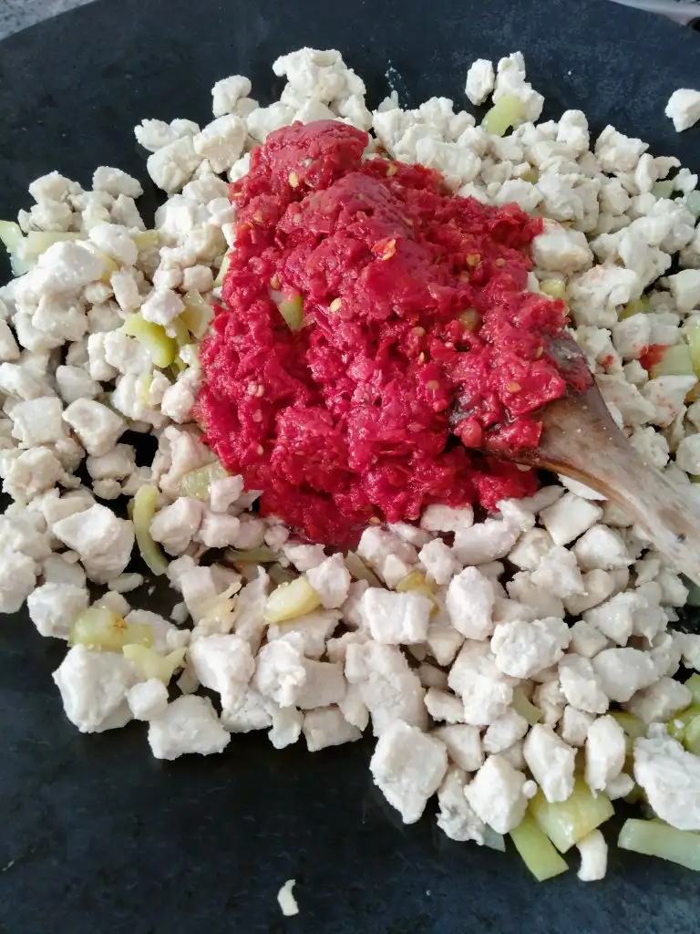 Kavrulan biberlerin üzerine tavuğumuzu ekliyoruz.