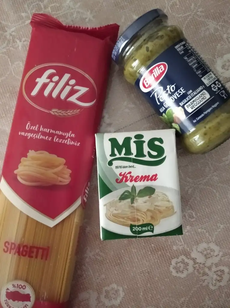 Makarna haşlanır.1paket krema ve 2 YK pesto hafif pişirilir ve haşlanmış makarna ile