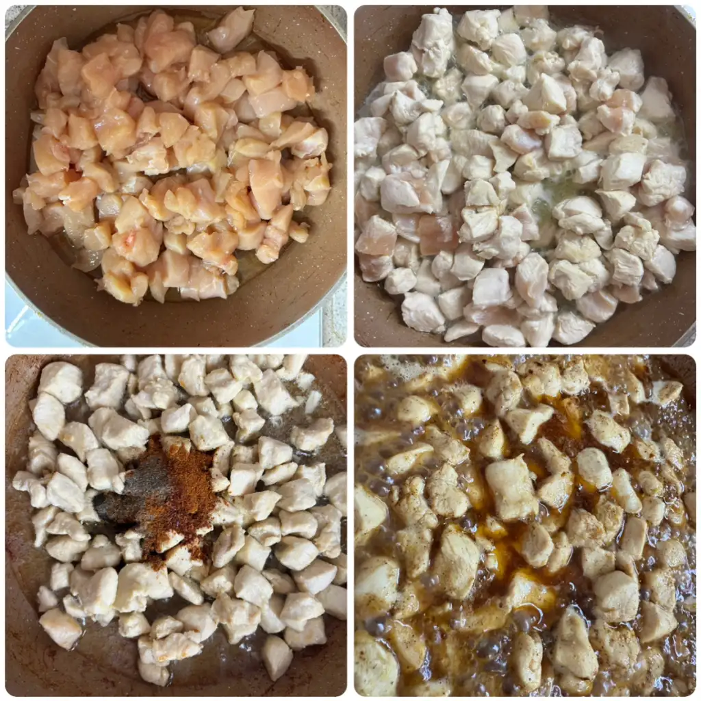 Tavukları kuş başı doğrayıp tavaya alıyoruz, yağlarımızı ilave edip tavuklar kendi suyunu salıp çekene kadar pişiriyoruz. Çektikten sonra baharatları ilave ediyoruz. Ben baharatları ilave etmeden bir kısım tavuğu çocuklar için ayrı tavaya aldım az acılı bile yemedikleri için. Baharatlarla beraber bir iki dakika pişirip sıcak suyunu ilave ediyoruz ve pişmeye bırakıyoruz.